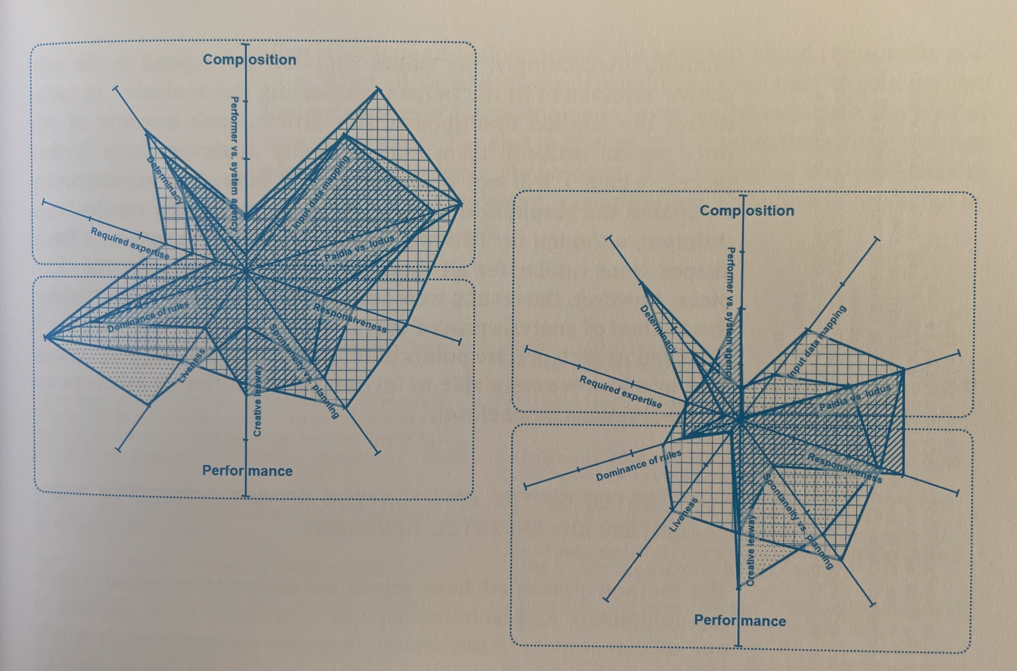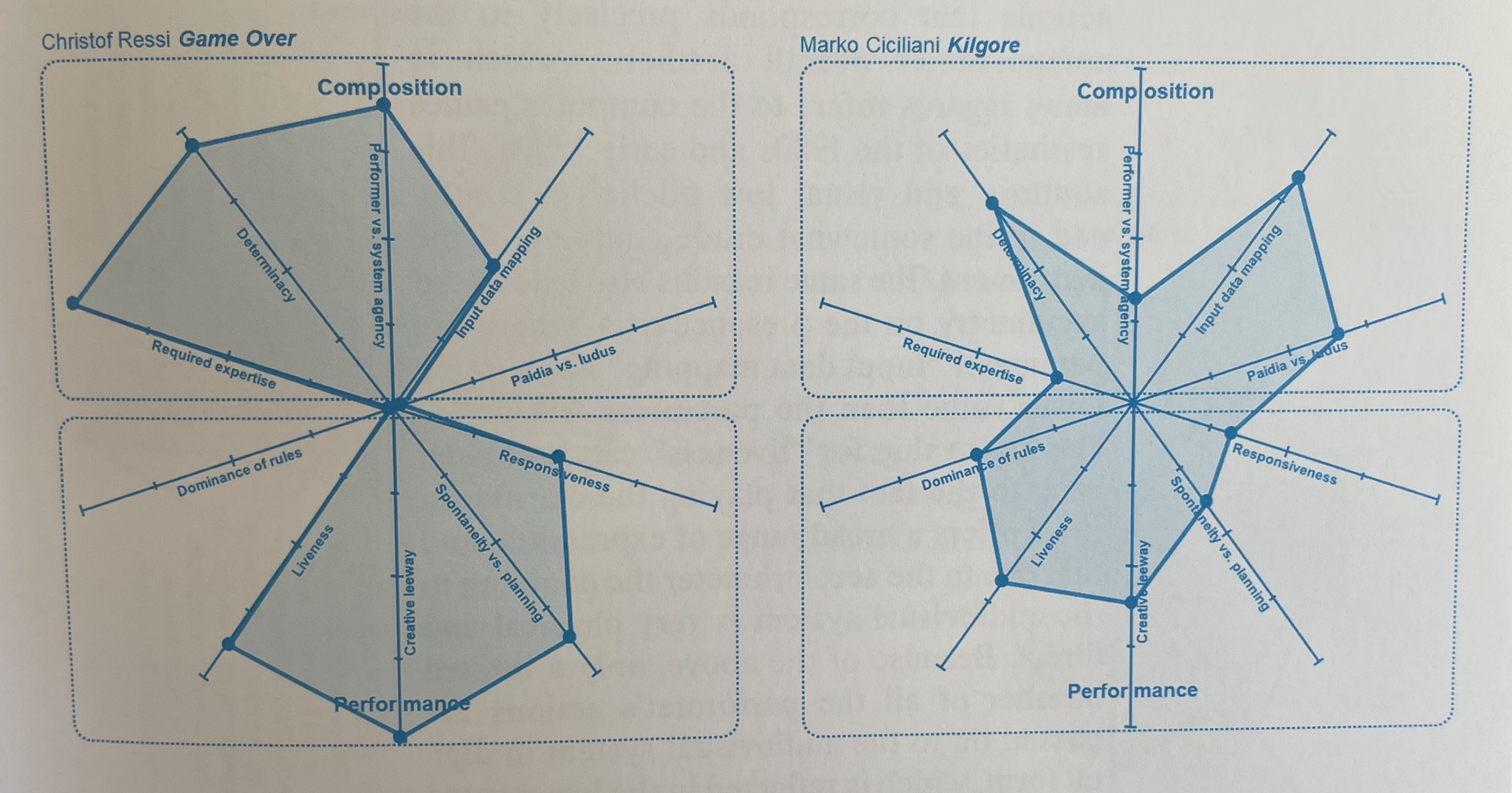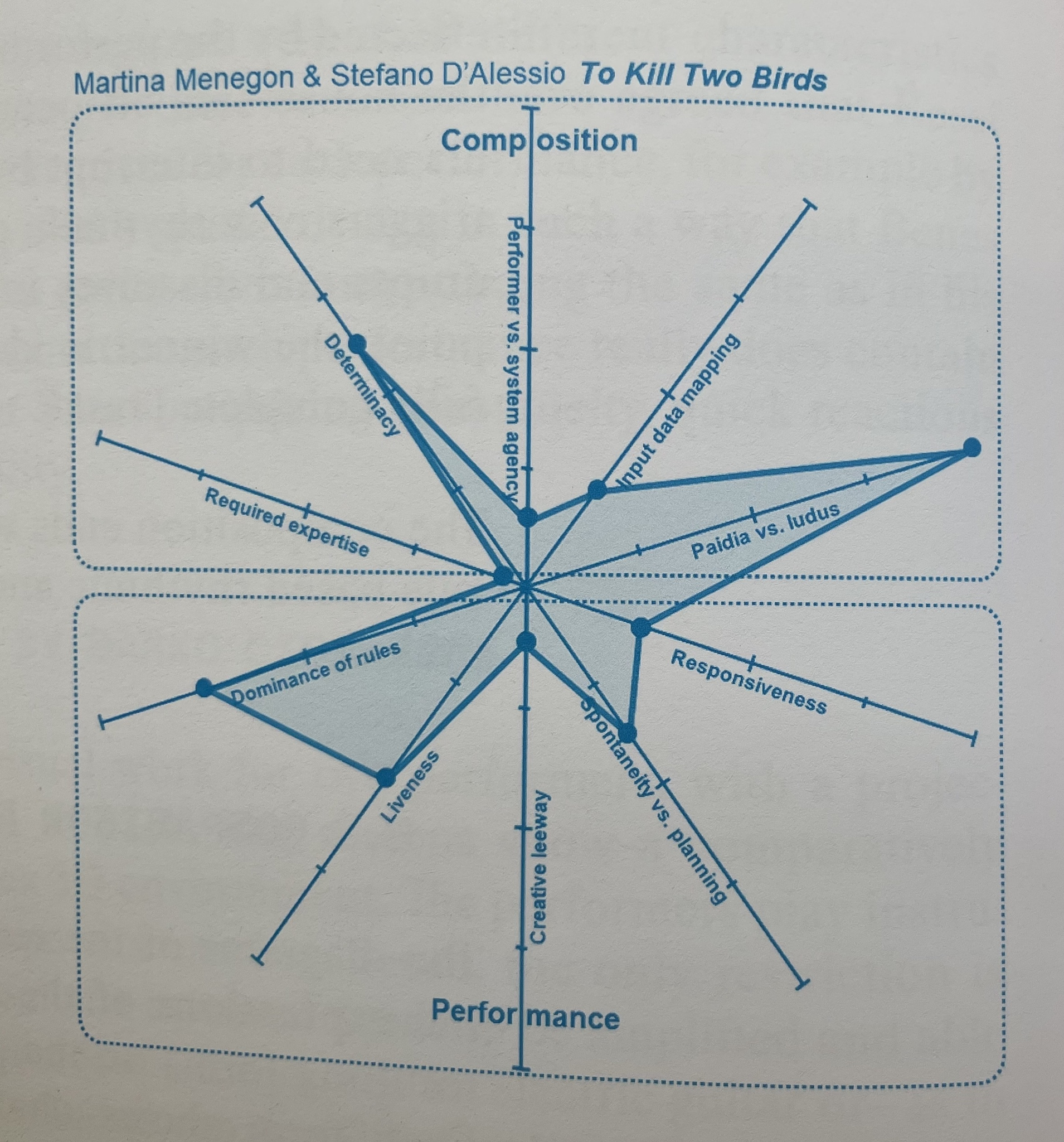 Ciciliani has chosen to structure the model with 10 parameters, sometimes defined in opposition (paidia vs. ludus, spontaneity vs. planning) and sometimes in absolute terms (dominance of rules, liveness...), following an unusual yet highly effective arrangement. The axes on which the 10 parameters are laid out are 5, essentially organizing the parameters into pairs through further categorization. These five axes, in turn, are divided into two sections: compositional choices, on the upper part, and performers’ perspective, on the lower one.
