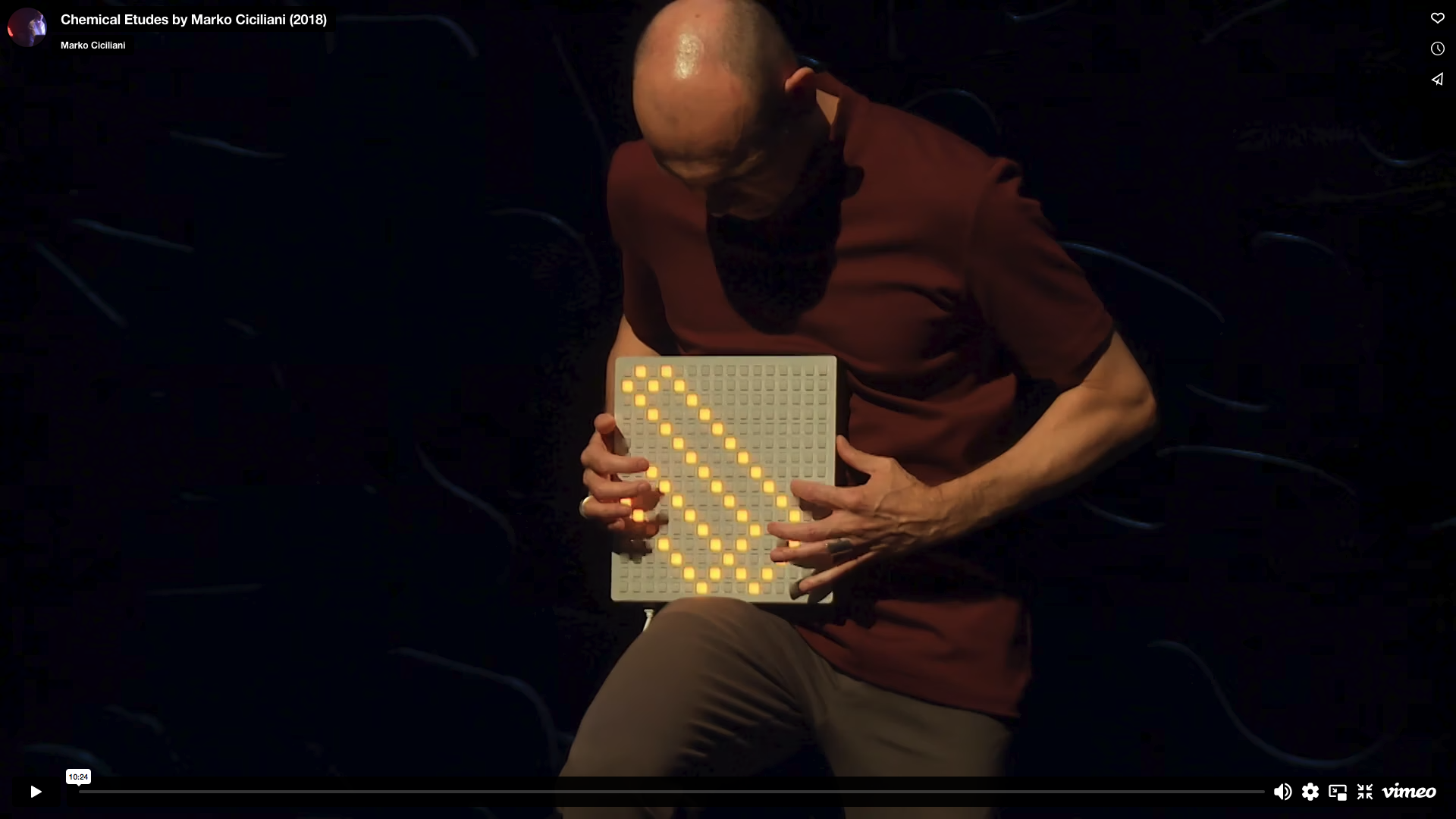 Although simpler in terms of technology and media aesthetics, Chemical Etudes provides a more responsive environment - therefore engaging the performer in a more stimulating setting, allowing more events to emerge. The visual elements suggest stimuli for performer actions, triggering sounds that, in turn, affect the sound landscape. This interaction between sound and visuals creates a deeply reciprocal relationship. The performer's actions, guided by visual cues, generate sounds that further interact with the visible elements, fostering additional musical interactions.