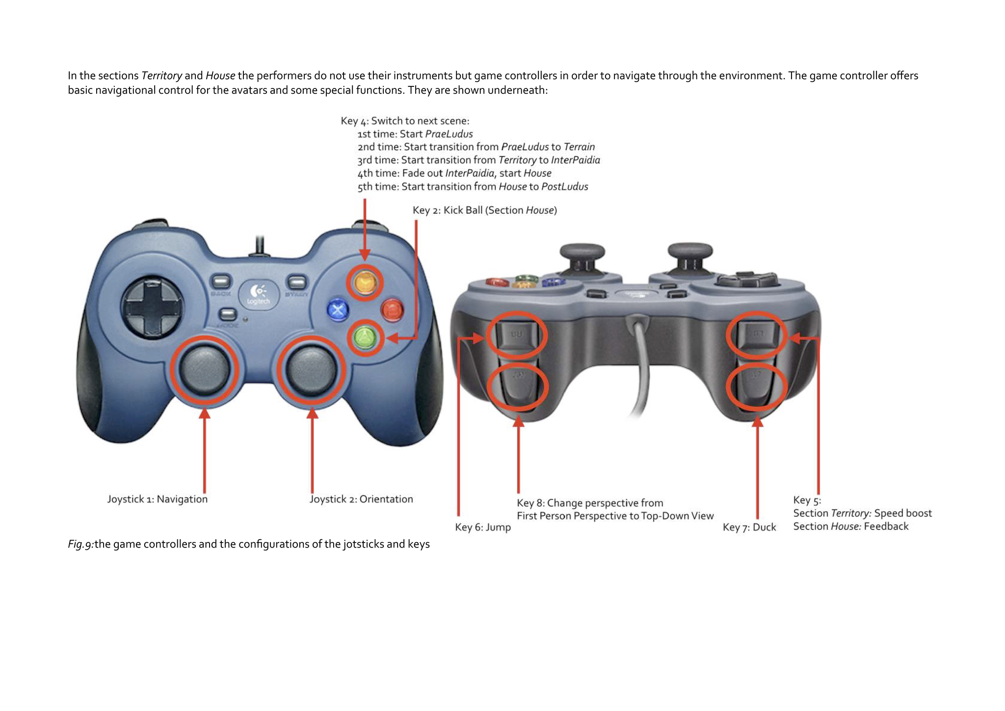 PreaLudus is the opening section of the performance, consisting of another game piece within itself, creating a sort of a recursive structure. In this part, players take turns performing short musical phrases composed of a random number of 16th notes (with a tempo ranging from quarter = 64 to 82). Ciciliani has devised a complex system to govern the alternation between the two players, who send each other the material to be played. Any mistake in the performance can be signaled by one player to the other using a pedal, which emits an Error Signal, triggering "a short fragment of an old synthetic recording of the Walkürenritt by Richard Wagner." In the second section, the players switch to the joystick and navigate through the territory shown to them, searching for objects that produce sounds with amplitudes based on their distance, aiding them in the process. Then, “six new red objects fall from the sky in relatively short time intervals. The pitches they produce together, once they have come to a halt, form a cluster chord. The task of the performers is the same as before: locate the objects, navigate to them and make them pop by colliding with them. With each pop a new pitch is formed, resulting in a new chord. Now the challenge is to collect altogether 5 objects. Once a player has collected 5 red objects, he/she gains a trophy”. Once again, the composer demonstrates a high level of detail and complexity in the design of this section, emphasizing the overall game setting and its sonic features to achieve the desired balance between performer interaction and outcome. The level of specificity in each task resembles a highly detailed sonification of a game flow, akin to composing a musical score rather than designing a game. It is important to note that these players don't have a narrative or backstory to guide their actions. Why search for red objects? What purpose do they serve? Are they attempting to defeat a formidable adversary, the boss of the red objects? No, such a narrative structure doesn't exist. Players don't complete tasks to attain a specific reward; their attention is also focused on the sound outcome, which guides their actions alongside the gameplay itself.