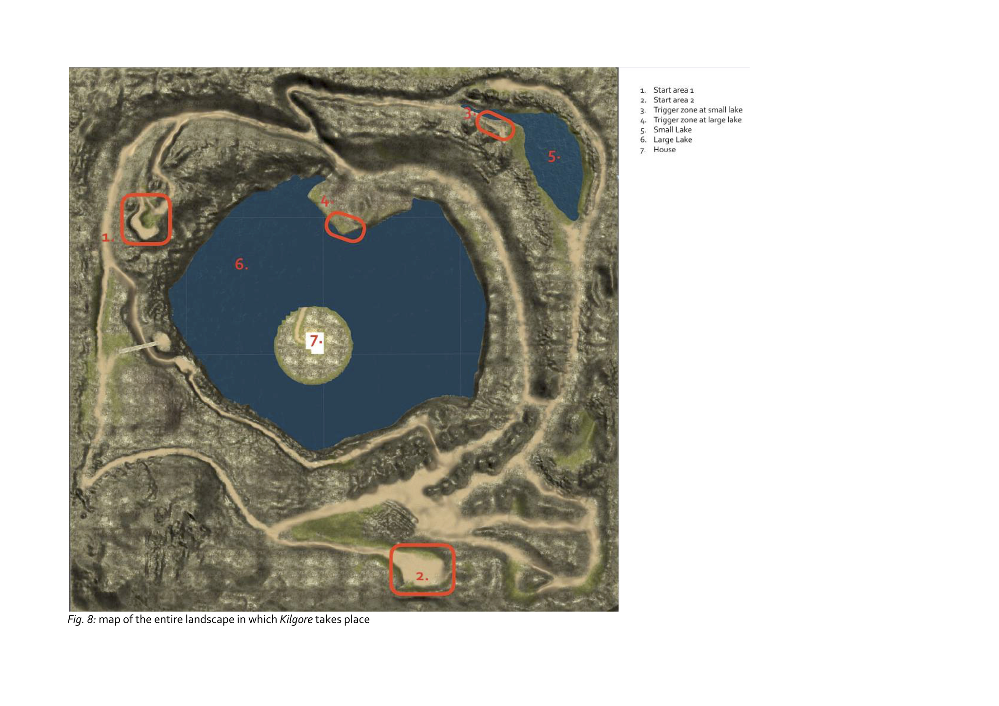In Kilgore, the stage features two performers positioned at the center, sharing both the same perspective and physical space. In the background, the video games they are engaging with are projected. Each performer has their own instrumentation: an electric guitar, drum pads, and two joysticks, through which they interact with the game and its stimuli. The sound is amplified through a quadraphonic PA system. The virtual setting of the video game comprises a 3D landscape depicting the surroundings of a lake within a canyon, with a house situated on an island at the center of the lake. The perspective offered is that of a first-person view, and “although the events taking place in the two games affect each other, each player is moving around in his/her own environment. The two players can never meet.” Their relationship is that of two competing players, therefore considering the overall game perspective as agonistic. “For every assignment there is a winner and a loser and at the end of the piece there is a champion who escapes the collapsing building while the other one is locked inside.”
