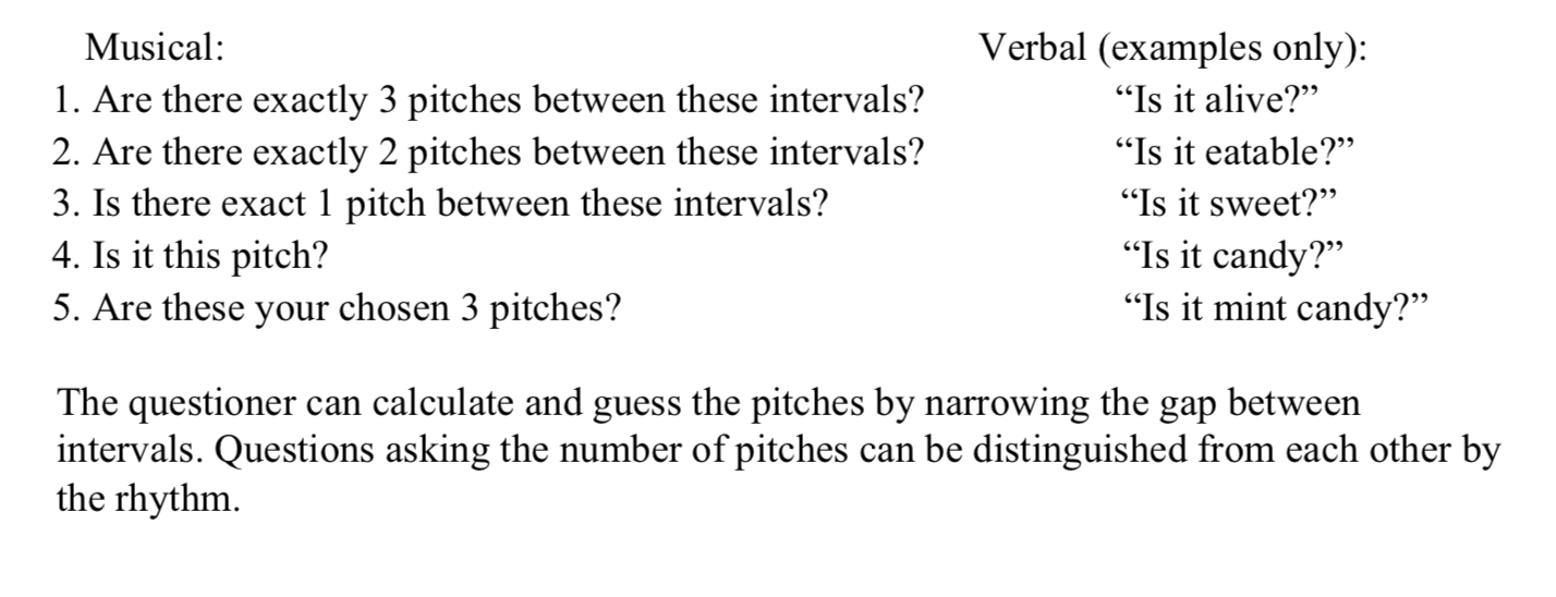 The compositional process undertaken by Il Hoon Son is a very direct translation: every aspect of the game has been translated according to a principle of adhering as closely as possible to the semantics of the original game. Firstly, the object to be guessed has been translated into one of the most recognizable musical parameters, aiming to make the gameplay dynamics immediate and easily perceivable by both the audience and the players. The Answerer thus chooses a pitch (or three, depending on the version) to play repeatedly, which will be the object that the other player must guess through the positions of their questions, which are in turn translated into sound productions of specific frequencies. In the following image, you can see an example of translation from verbal to sonic communication, expressed in relation to the version of 20 Questions with three pitches to guess: