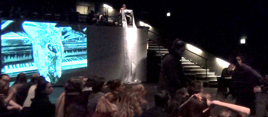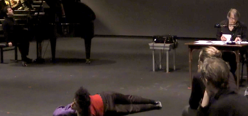 In my collaboration with the Theatre company Muta Imago, these notions of interpretation are activated by the needs, constrains and challenges of producing a new version of Bruno Maderna’s Hyperion, focusing in the double dramaturgical and dramaturgic-musical roles of the solo instruments, and the use of recordings of the orchestral parts as a sound object both contributing to the musical structure as well as providing a dramaturgical character: an aural representation of a different temporal and spatial plane, one that both sustains and collides with the “live” performers.