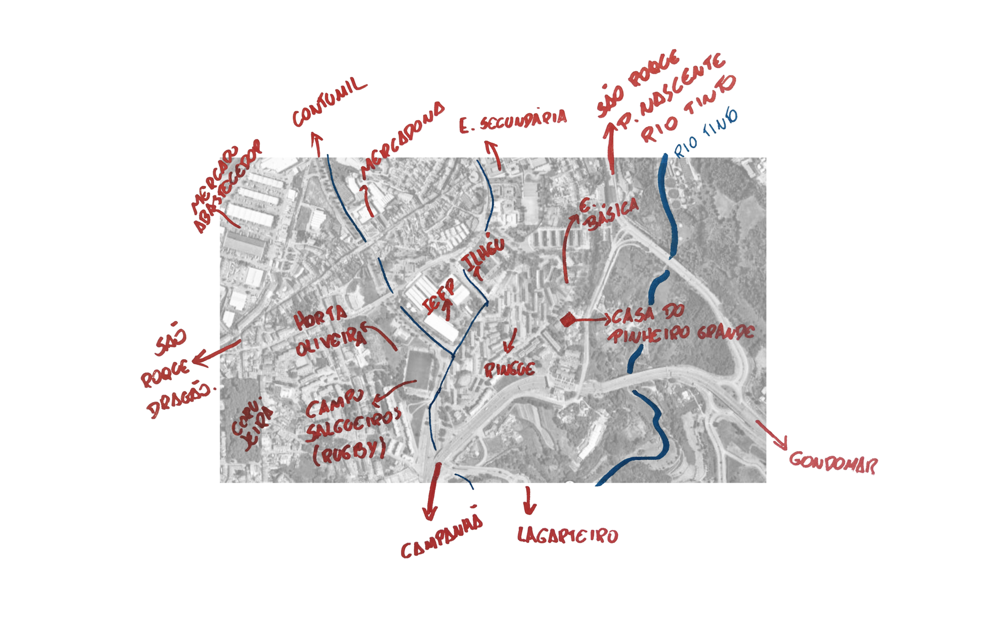 Dois processos estão em curso, oficinas de levantamento e reconhecimento do território urbano, que se debruçam sobre um território mais amplo, na busca de construir um vocabulário comum; e a construção coletiva do Jardim do Pinheiro Grande, com a retomada do espaço exterior do edifício.