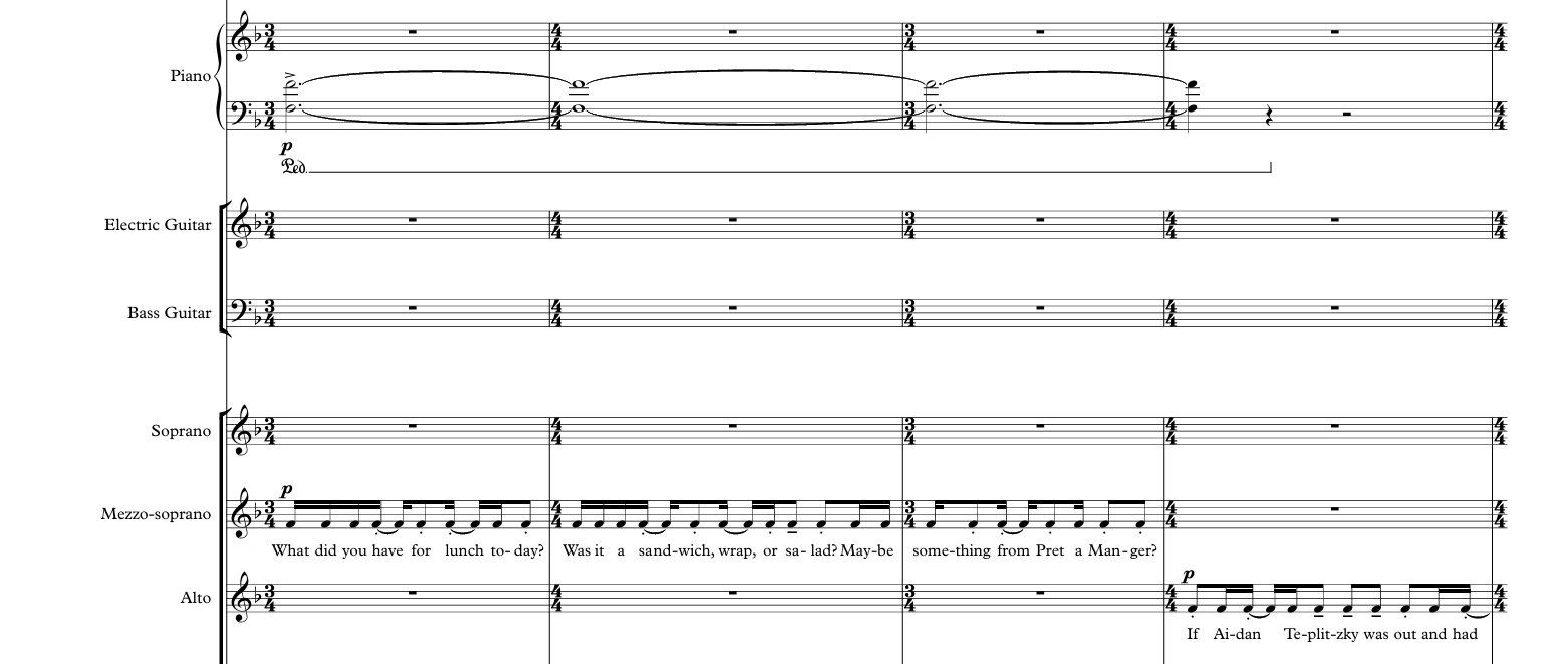 By having the music become more expressive during the descriptors of how I pretend my plain baguette tastes (such as being like meat or cheese), the musical language has the capacity to be more emblematic of typical classical music while still embodying a creativity in thriftiness. This is further emphasised by having both the sung melody and the instrumental accompaniment stop near the end of the composition, leaving the text to be projected by itself at the end to make the musical colouring more evident. The text also provides the greater context as to why I choose to eat a plain baguette, the potential health issues of this, the class-based history of why I eat a plain baguette, and how such experiences have shaped my ways of being to this day. In doing so, the composition enables a relational network to be established to provide the detail and relationships that connect my working-classness with being a fussy eater.