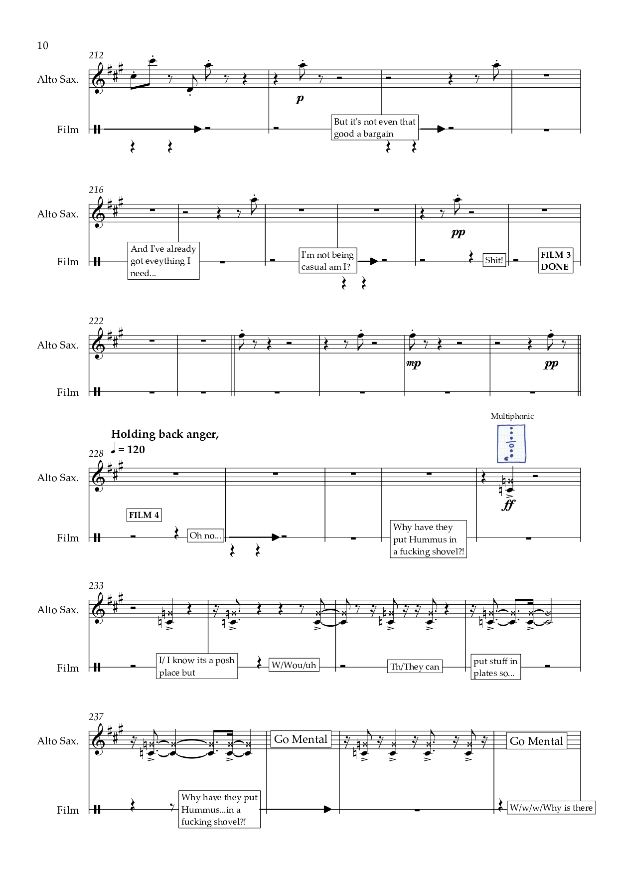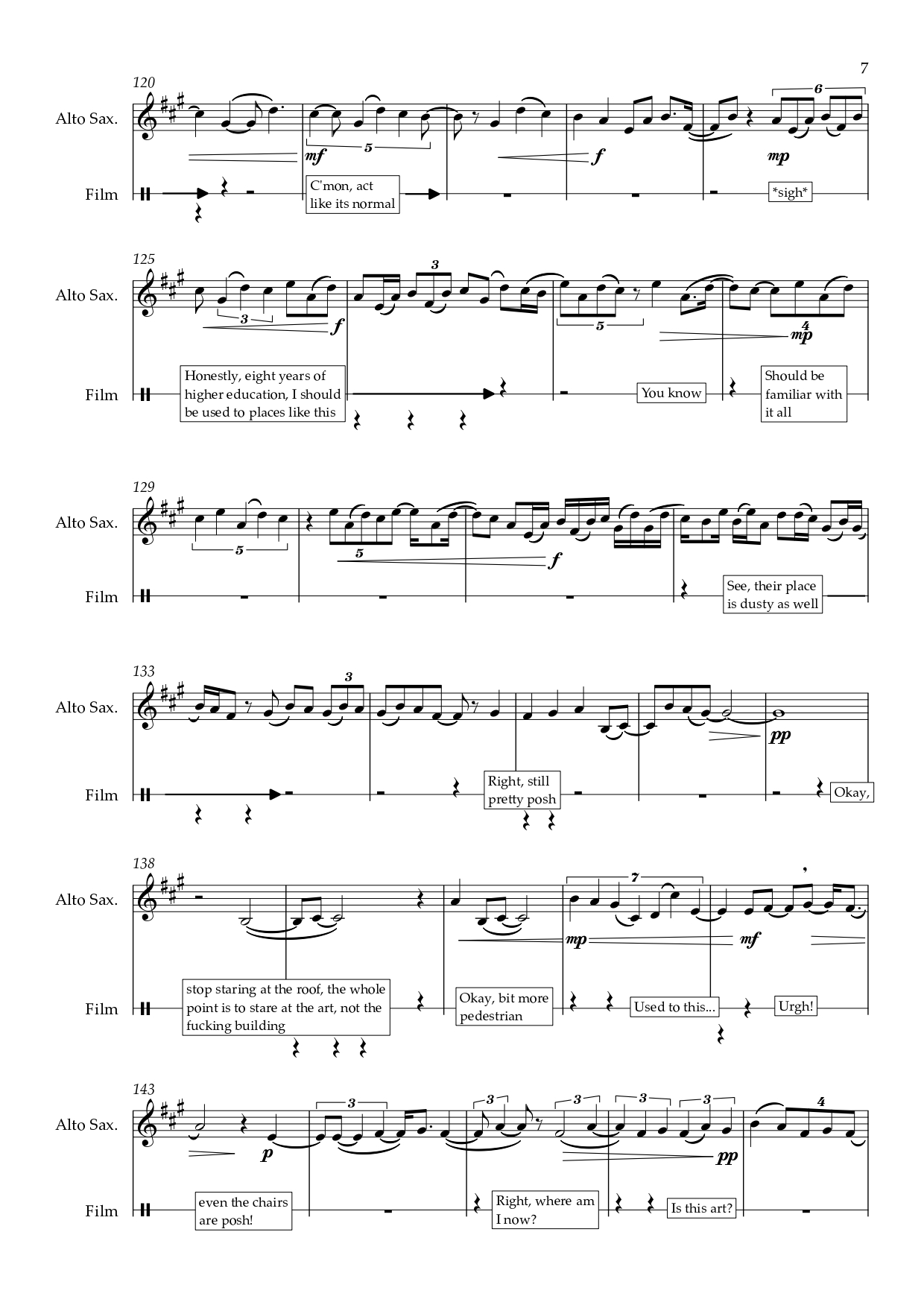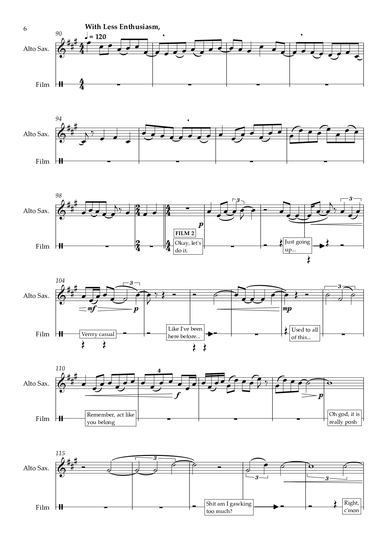 Developing on from Escapism I wanted to explore whether I needed to adopt a multiple movement structure of blatantly working-class movements to allow space for more emblematic classical music. I also wanted to return to explore more explicit aspects of classical music’s culture (such as musical form). In Theme With Variations Forced by Expectations for Alto Saxophone and Film, I reconstruct the idea of a theme with variations to address ideas of code switching in working-class experiences and the impact of these changes on personal understandings of value. Code switching is a process wherein people from outsider communities adjust their personalities and identities to better suit the dominant environments they interact with (see Gardner-Chloros, 2009). In considering class-based experiences of code switching (see Ashcraft, 2012), Theme With Variations Forced by Expectations uses several scenarios as an impetus for causing changes to the musical theme. These scenarios are:
