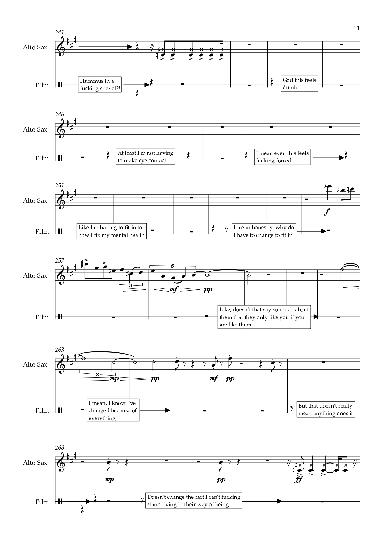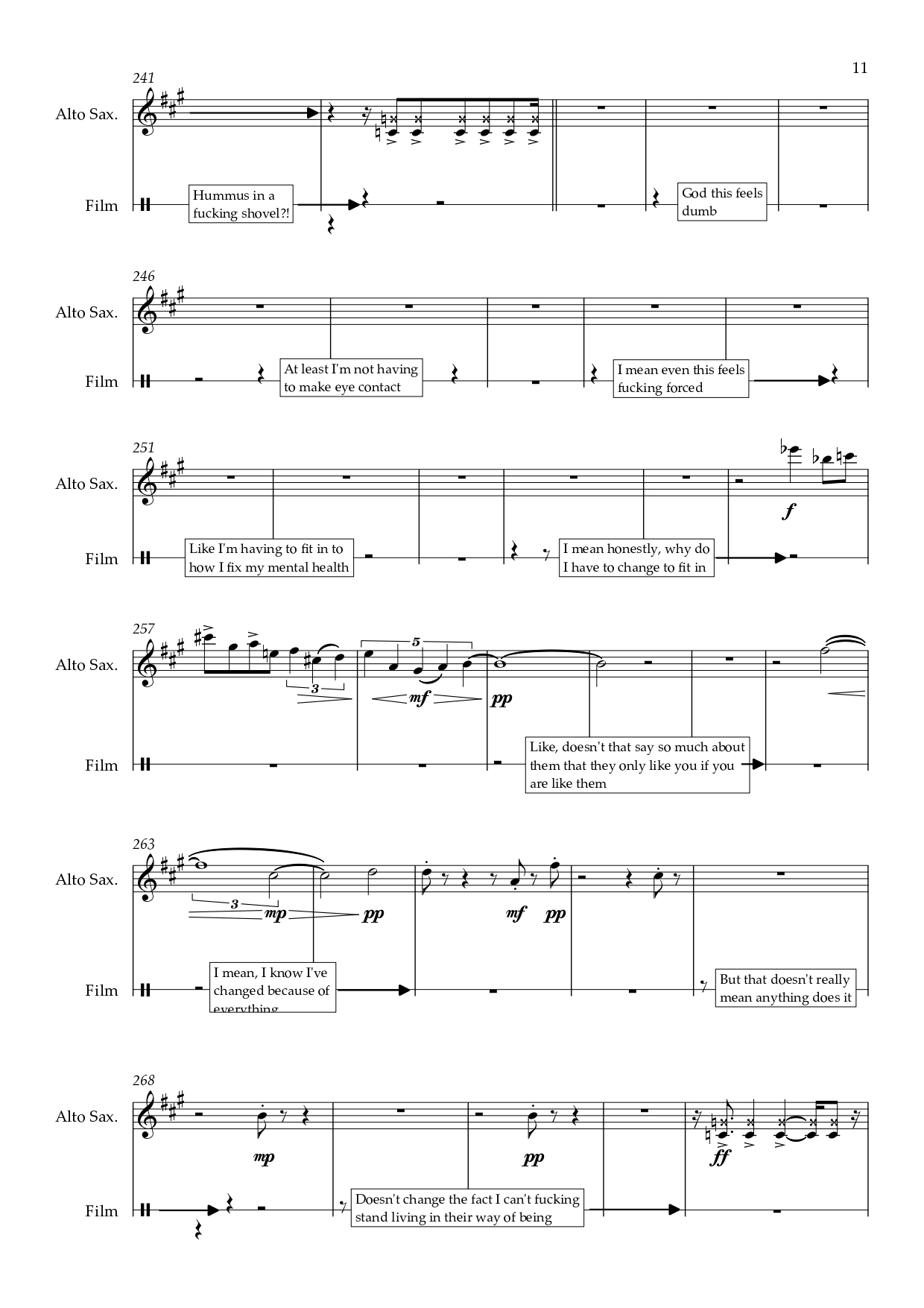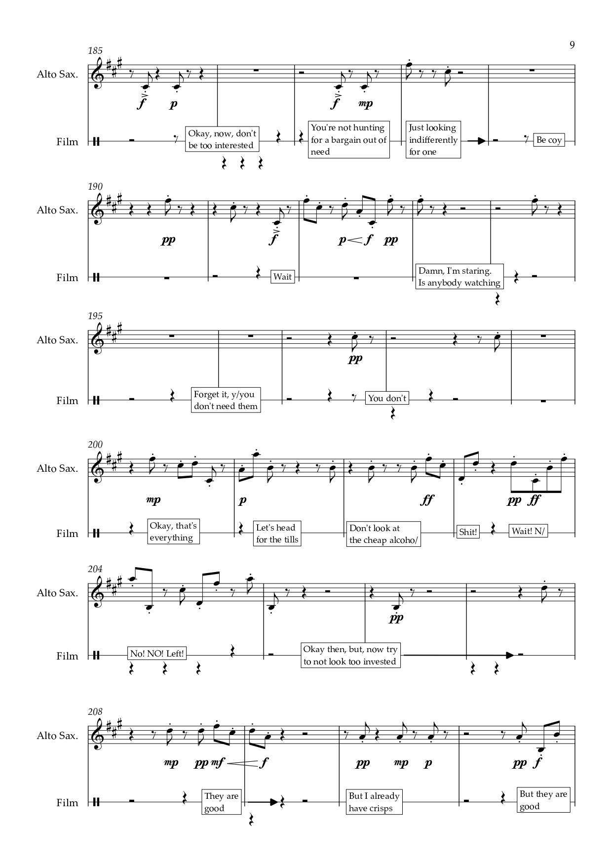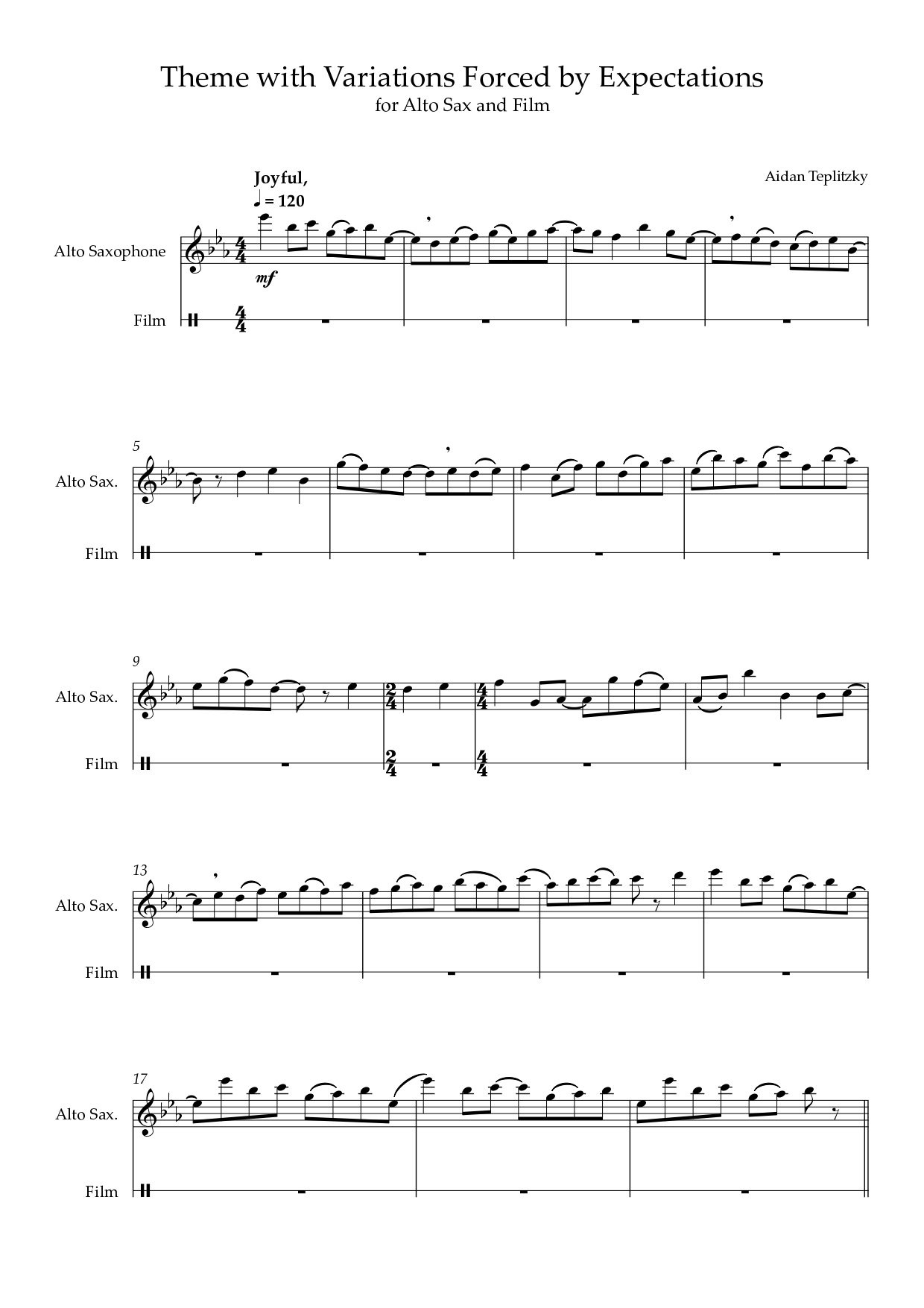 Developing on from Escapism I wanted to explore whether I needed to adopt a multiple movement structure of blatantly working-class movements to allow space for more emblematic classical music. I also wanted to return to explore more explicit aspects of classical music’s culture (such as musical form). In Theme With Variations Forced by Expectations for Alto Saxophone and Film, I reconstruct the idea of a theme with variations to address ideas of code switching in working-class experiences and the impact of these changes on personal understandings of value. Code switching is a process wherein people from outsider communities adjust their personalities and identities to better suit the dominant environments they interact with (see Gardner-Chloros, 2009). In considering class-based experiences of code switching (see Ashcraft, 2012), Theme With Variations Forced by Expectations uses several scenarios as an impetus for causing changes to the musical theme. These scenarios are: