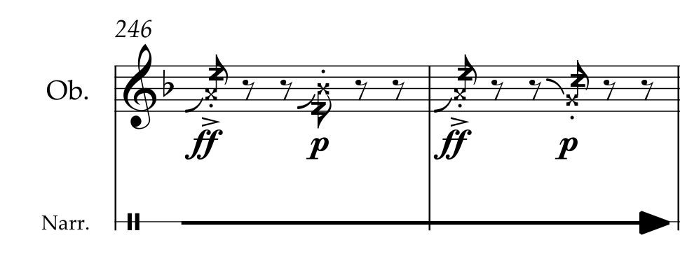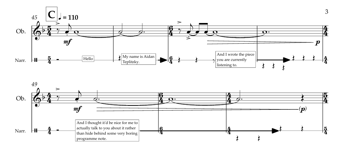A relational network is again established here but rather than having several individual pieces as in Seven Working-Class Time Pieces, the composition achieves a relational network by providing several sections that connect to create a narrative for the oboe’s classed position (e.g. the ways in which different instruments are classed). Having the combination of content and context to explore the tension in making an oboe sound working-class enables the composition to effectively address classical music’s culture through unpacking the class identity of the oboe. It’s Hard to Make an Oboe Sound Working-Class provides a key development in my research towards trying to effectively embody working-classness in classical music. By having the composition use a particular aspect of classical music’s identity (in this case an instrument) to explore how working-classness may be embodied in classical music’s culture (through the ridiculousness of emulating stereotypical accents), It’s Hard to Make an Oboe Sound Working-Class provides a development in understanding how working-classness can be embodied in classical music and provide new creative possibilities.