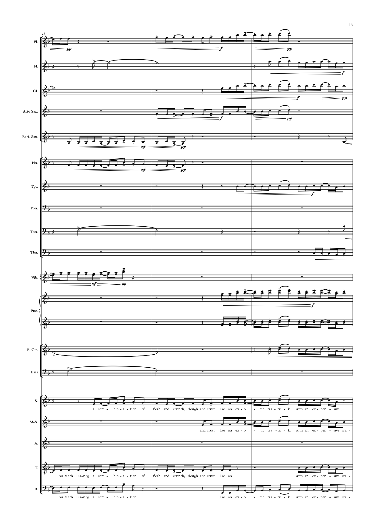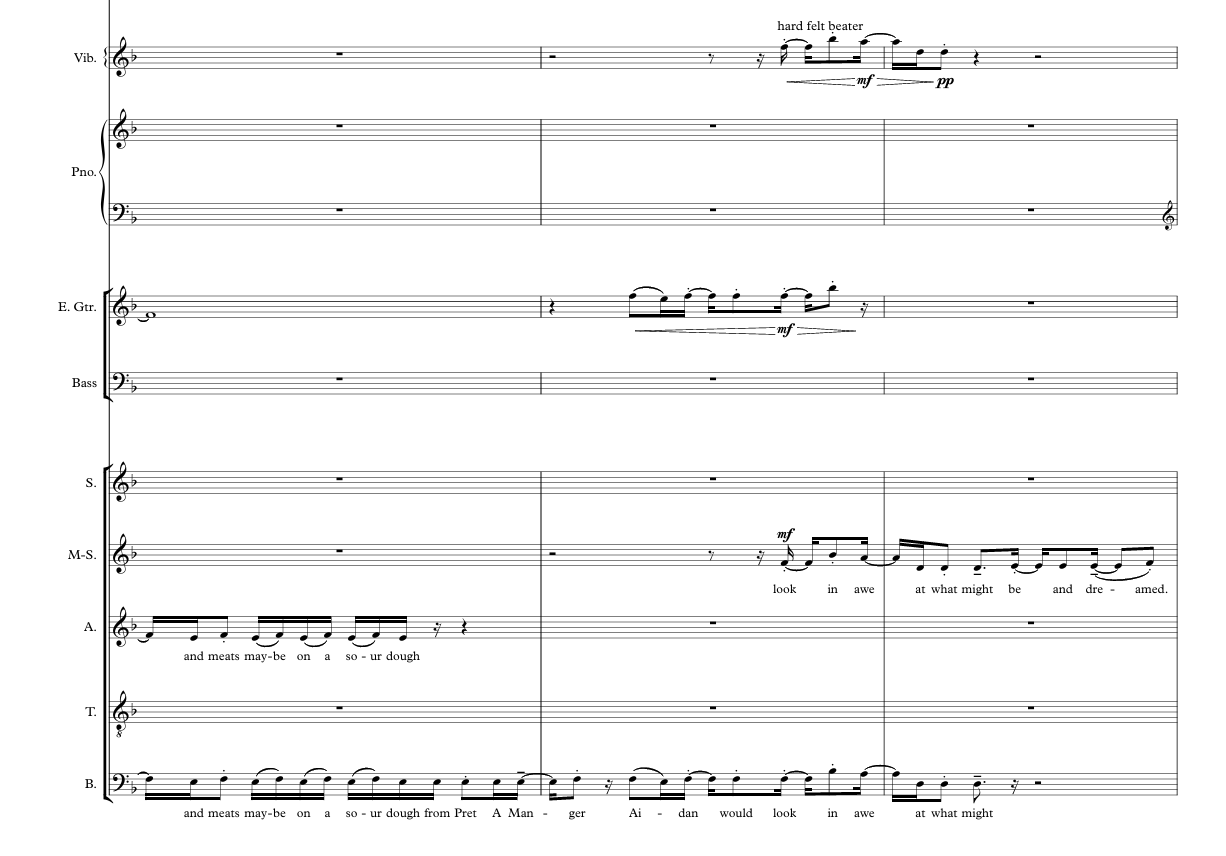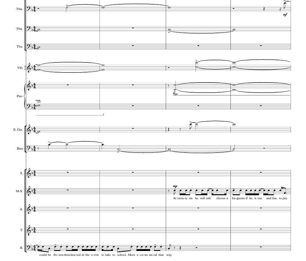 Developing from these concerns, Baguette Baton offered a means of identifying such contextual markers and an opportunity to explore how to enable a greater level of expressive music within a creativity in thriftiness. In Baguette Baton for large ensemble, SSATB singers, and projected text, I explore the class-based reasoning behind being a fussy eater and the ways of validating such behaviour. The composition effectively uses a creativity in thriftiness by having all the musical material be limited to supporting the sung text through a combination of long held notes (CiT1 and CiT5)