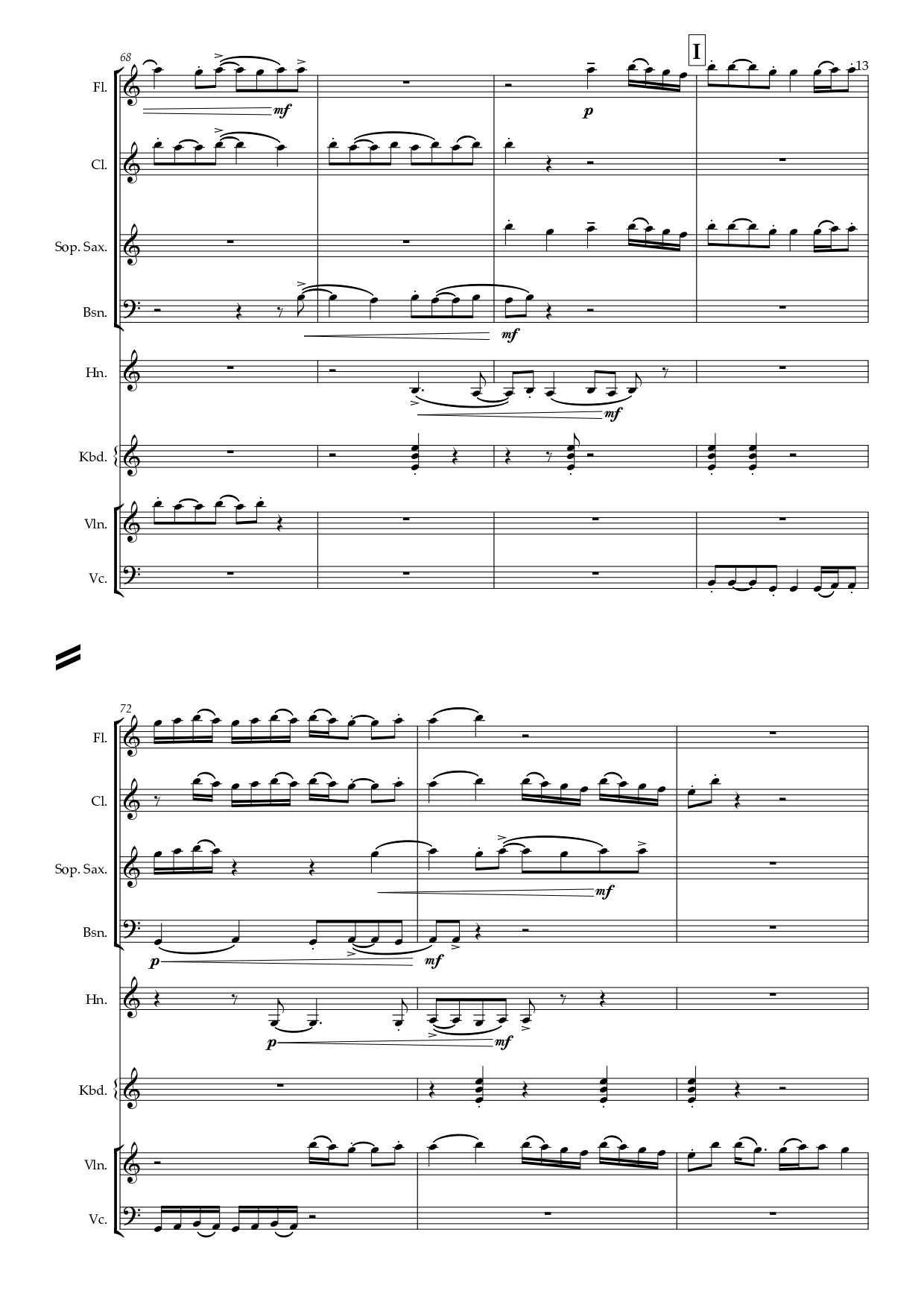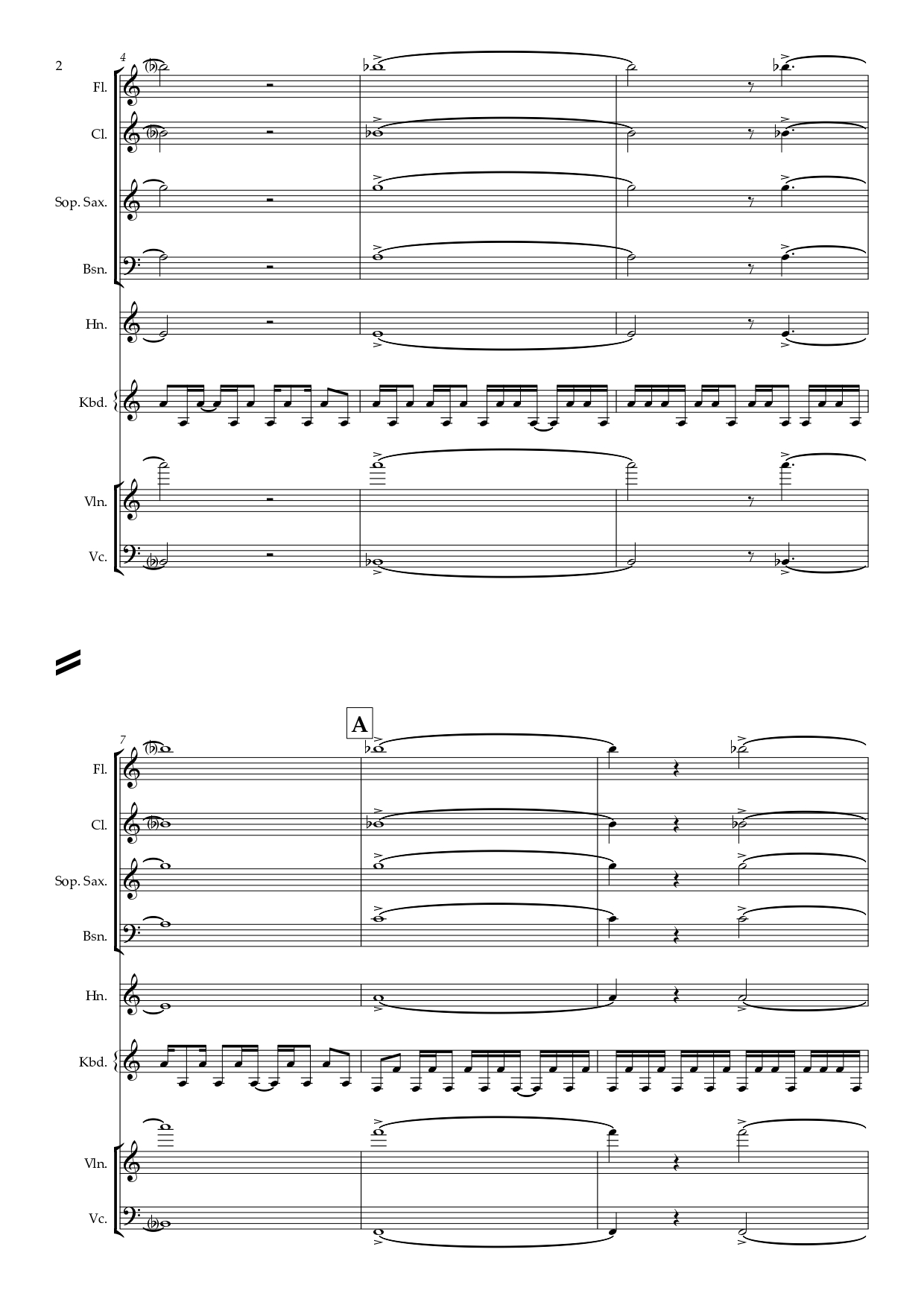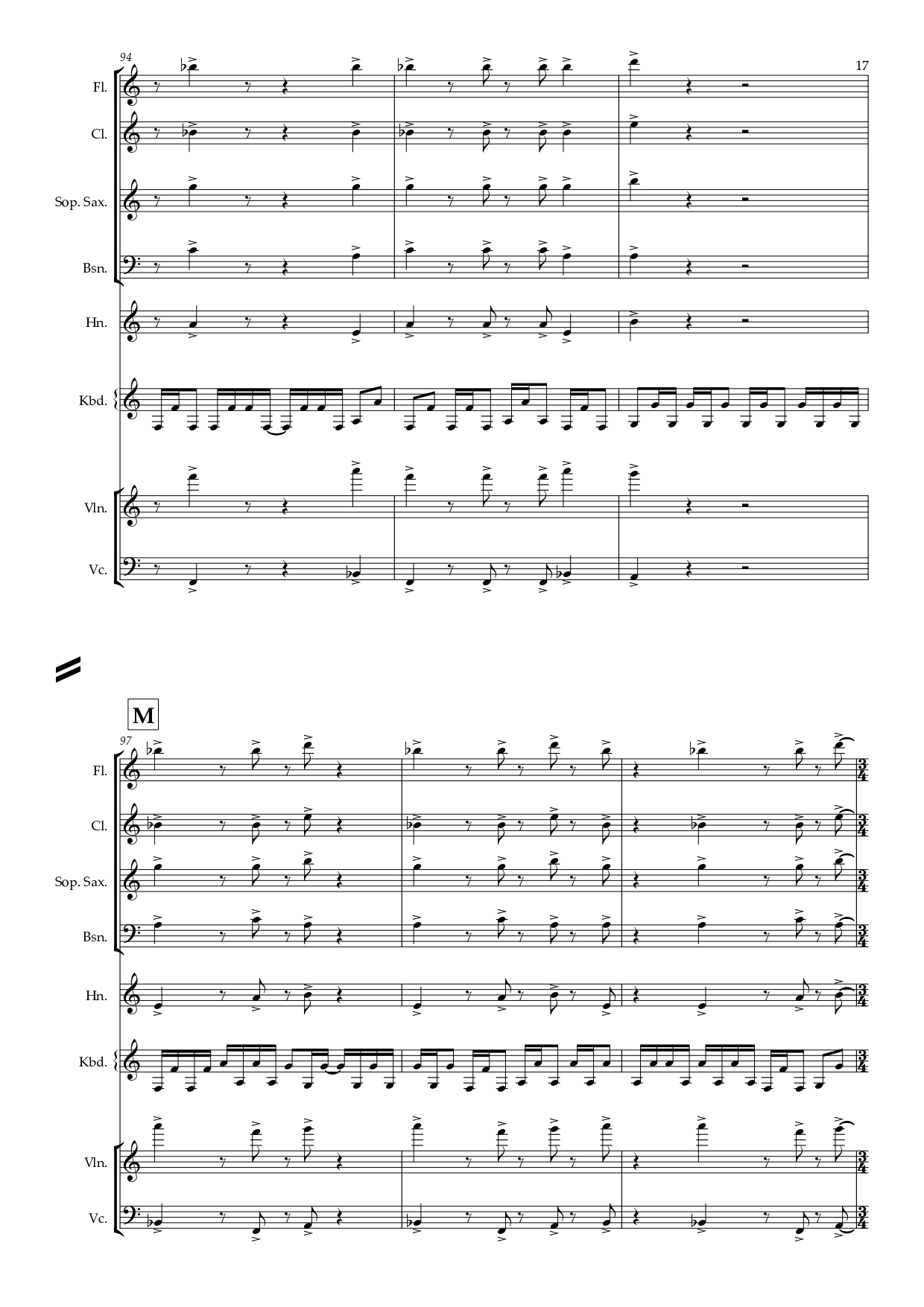 1. The ensemble play a hopeful melodic motif that shrinks as the piece develops, similar to 1. Expiration Date from Seven Working-Class Time Pieces, CiT1 and CiT3. Please click on images to enlarge.