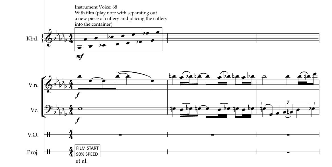 Considering how the music works with the interdisciplinary elements, the ensemble’s motif functions as dramatic underscoring to the text to emphasise the feelings of aspiration towards hopeful career progression due to your hard work. Such aspirations decline over time to eventually be lost as it becomes clear the hard work provided is not going to be rewarded (in a similar manner to 1. Expiration Date from Seven Working-Class Time Pieces). The keyboard’s repeating scale also provides a feeling of aspiration. Having the keyboard’s scale fail to resolve to the tonic and having to continue to repeat to match the repetition of polishing cutlery provides the feeling of hopelessness in trying to escape the problems with working-class lives through believing in meritocracy.