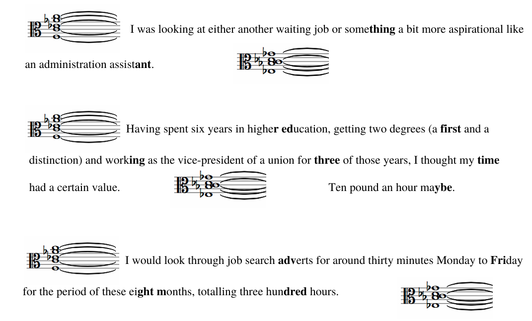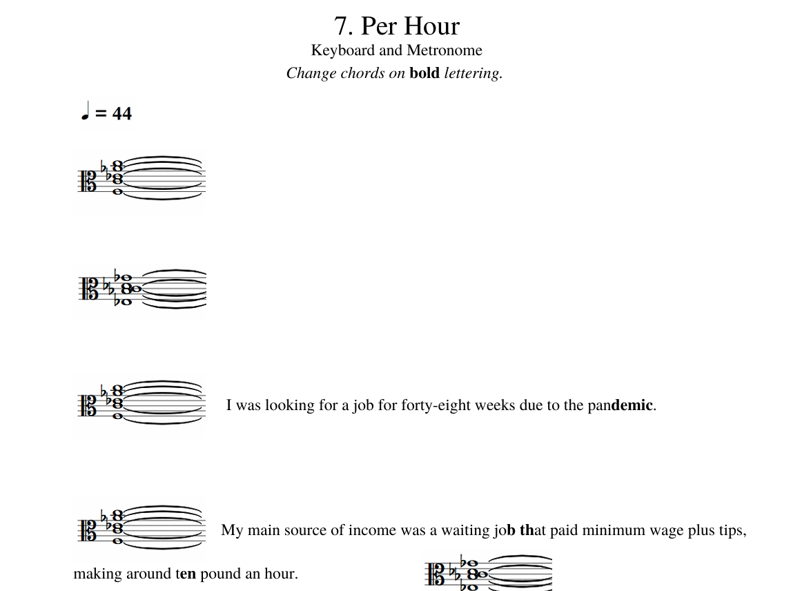 7. Per Hour – the music floats between a fast and slow change (CiT4) between a F minor 7 chord and an Eb minor 7 added 6th chord to provide a listless yet hopeful desire for steady work, emulating both the excitement of possible employment with the increased rate of change and the attempts to sustain enthusiasm with the return of the metronome at the end.