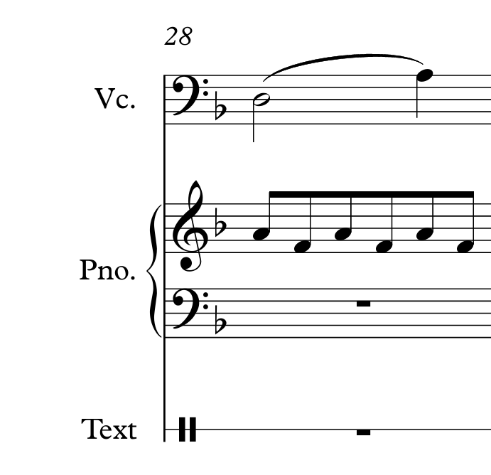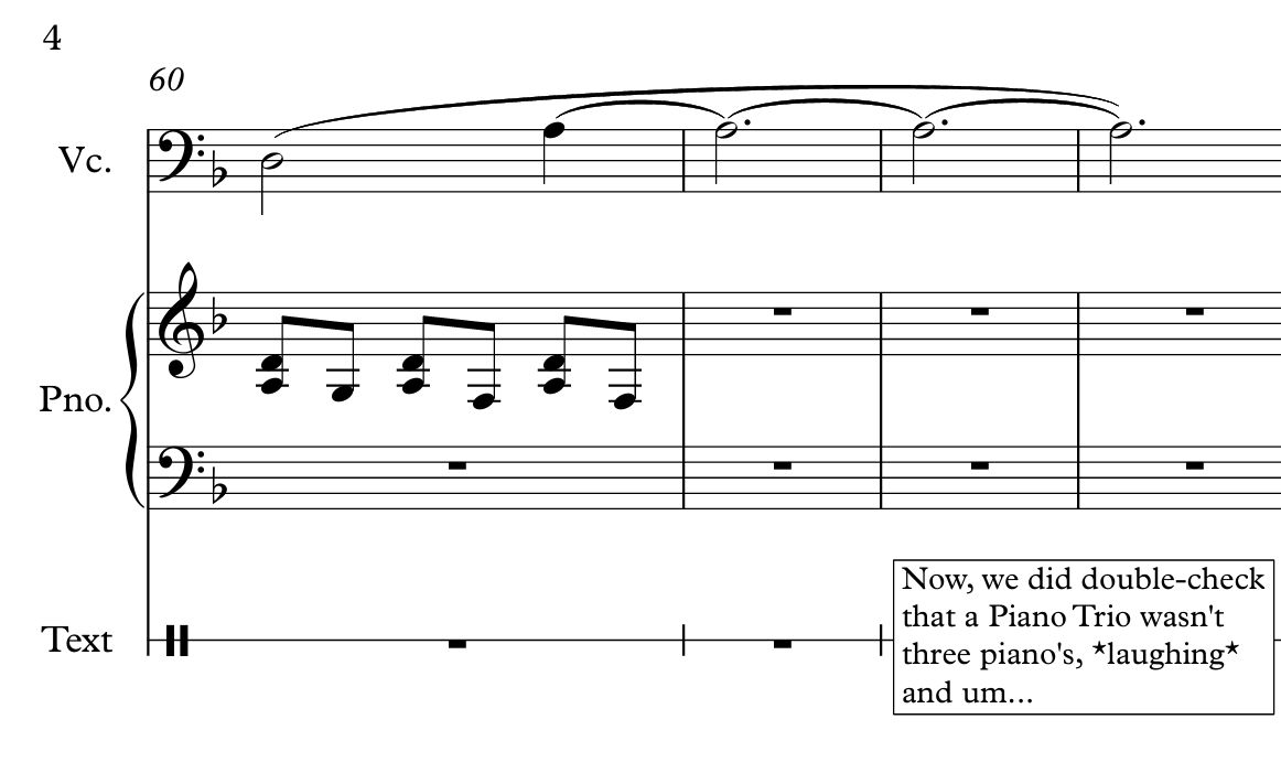 Leading on from It’s Hard to Make an Oboe Sound Working-Class, I wanted to further explore how I could embody working-classness into another aspect of classical music’s culture. In Budget Cuts to Faure’s Piano Trio in D Minor, I approached the idea of a chamber ensemble, the piano trio, to explore how the precarity of the working-class experience may affect it. Budget Cuts to Faure’s Piano Trio in D Minor for Piano Trio and Narrator has the ensemble react to a mediocre arts administrator informing them of the lack of funds to perform Faure’s Piano Trio in D Minor, which has resulted in the Piano Trio being unable to afford its violin player. Acknowledging the struggles of funding and compromise that exist in classical music, the composition actively shows how the impact of compromise can be experienced musically and theatrically. A creativity in thriftiness manipulates the original musical ideas from Faure’s composition (CiT7) using repetition (Cello bar 3 repeating at bar 28, bar 32, and bar 102, CiT1),