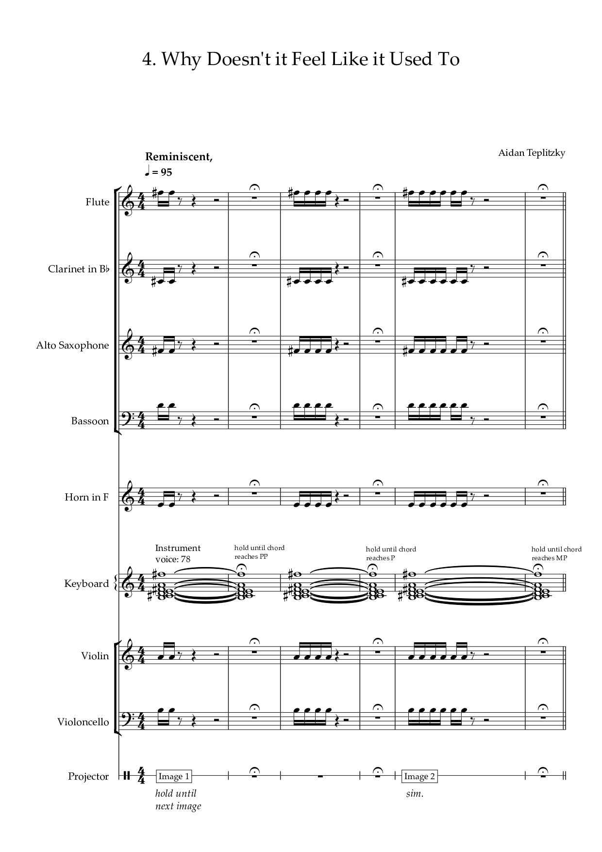 4. Why Doesn’t it Feel Like it Used To provides a creativity in thriftiness to explore my experiences of underage drinking. The movement uses a series of screenshots of varying smiling emojis and alcoholic beverages against a bright yellow background. Beginning with a bottle of Smirnoff Ice and eventually ending with a bottle of reasonably tasty red wine, the screenshots eventually change to have less enthusiastic emojis and a less saturated yellow background to match the declining joy to be found in drinking due to building up a tolerance for alcohol. Musically, the keyboard provides a series of long held chords that are left to fade out naturally due to the instrument voice used, CiT5. These chords are accompanied by the ensemble providing stab chords that gradually become repeated notes that eventually fall apart to provide a further decline in the enthusiasm of the drinking, CiT1, CiT5. Please click image to enlarge.