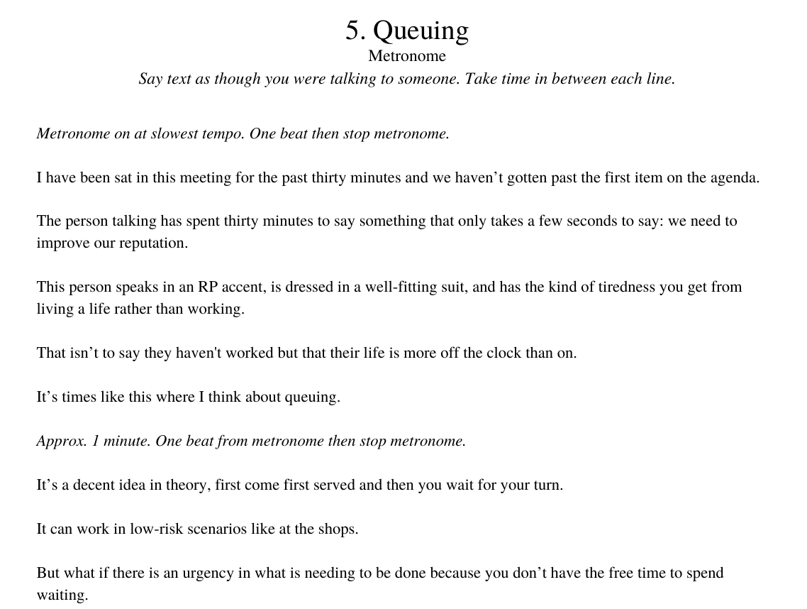 Using a metronome came about quite quickly as it provided both an auditory and physical representation of time passing. I consider the use of the physical metronome to provide a looming presence across all of the pieces whereby all text and music is constrained by the constant presence of time impeding on the artistic outputs. Such restrictions are most blatant in 2. Off Time, 3. Needed Time of Arrival, 5. Queuing, and 7. Per Hour. The use of the metronome in 2. Off Time and 3. Needed Time of Arrival was to provide a restriction to how the text is delivered. In 2. Off Time the text was limited to a word with each beat. This ensured that shorter words felt abrupt while longer words felt rushed to provide a listlessness as expressed in the text of never being able to switch ‘off’ time. In 3. Needed Time of Arrival the constriction of the metronome was achieved through each syllable being read with each tick of the metronome to provide an agitation to the delivery and a sense of counting each passing moment to emulate the sensation of running out of time. In 5. Queuing the metronome is set to the slowest speed possible and stopped by the performer to show the suspension of time and awareness of time slowing down within meetings that wasted time. The decision to have 5. Queuing consist solely of the metronome and the text was to highlight the tedium of waiting and to remove any potential distraction that music could provide. In 7. Per Hour the metronome comes in at the very end of the piece to regiment the former flowing change between the two chords. This is to highlight the forced attempts at optimism in finding a job as highlighted within the text. In the rest of the pieces, the metronome’s ticking presence provides a constant reminder of the passing of time to provide tension over each piece’s scenarios.