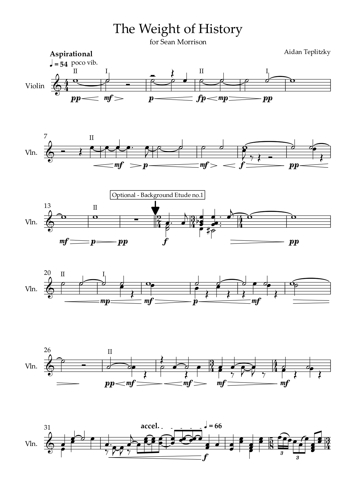 In The Weight of History and Background Etudes for Violin and Film, I explore the Chaconne from the Bach Violin Partita No.2 in D Minor (Bach, 1717 - 1720) to provide a parallel between the histories of learning an instrument and dealing with the cultural significance of a piece of canonic repertoire. A creativity in thriftiness is achieved by having the musical language consist primarily of the opening chords from the Chaconne (CiT7).
