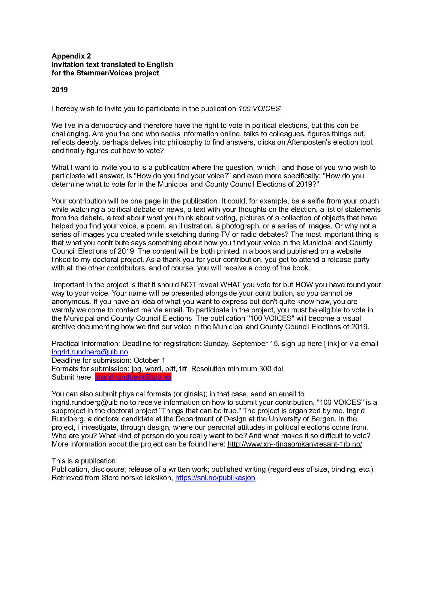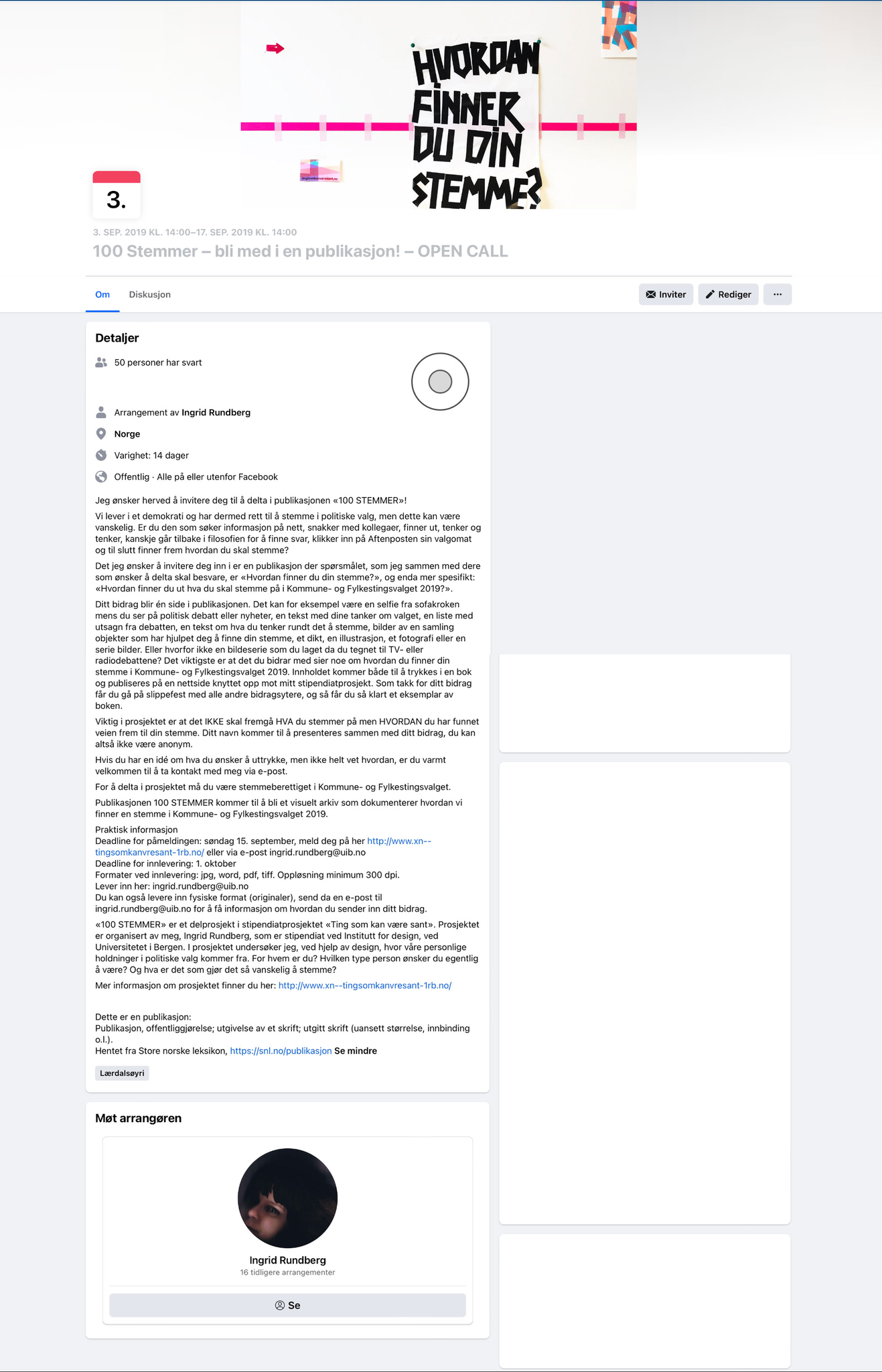 Rundberg, Ingrid. 2019a. "100 Stemmer – bli med i en publikasjon! – OPEN CALL."