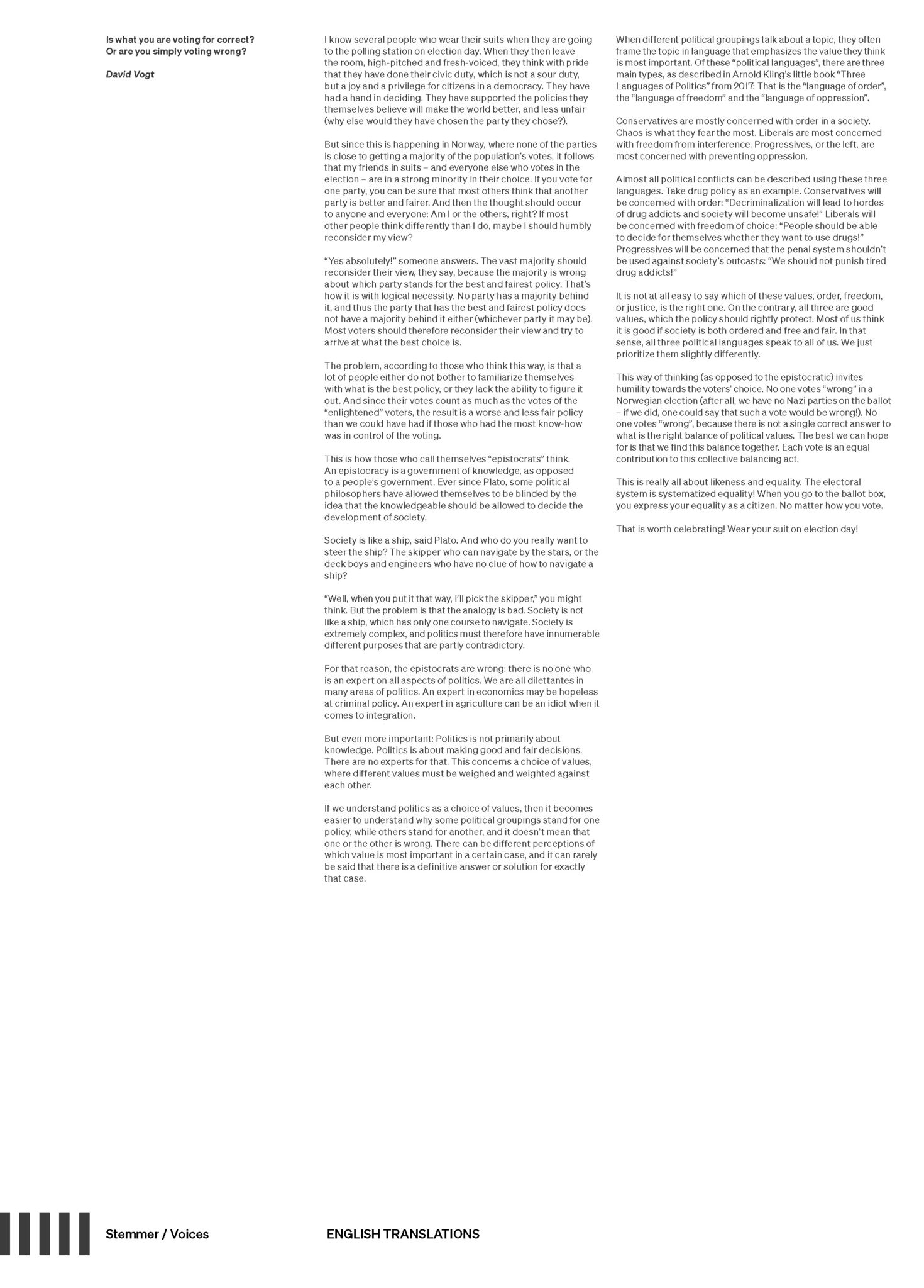 Vogt, David. 2021. "Er du i tvil før valget? Spør din indre valgomat." Bergens Tidende, 26 July, 2021, 2021. https://www.bt.no/btmeninger/kommentar/i/bzzPRA/er-du-i-tvil-foer-valget?utm_source=kopierlink&utm_content=deleknapp&utm_campaign=topp