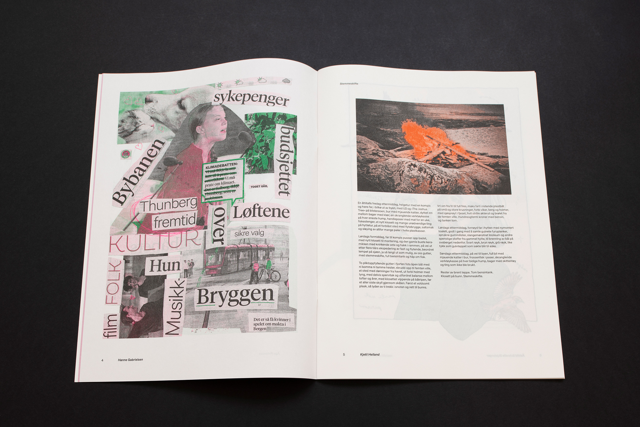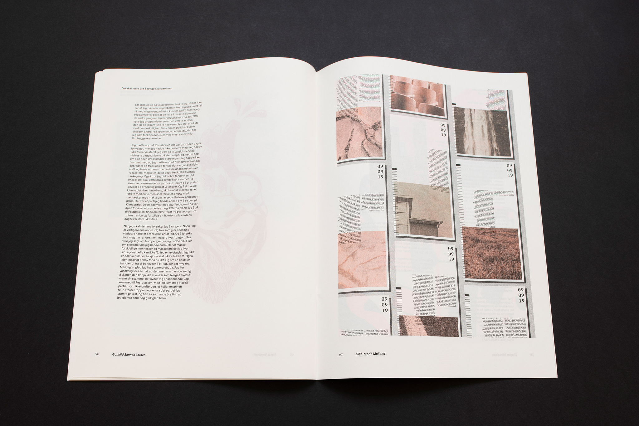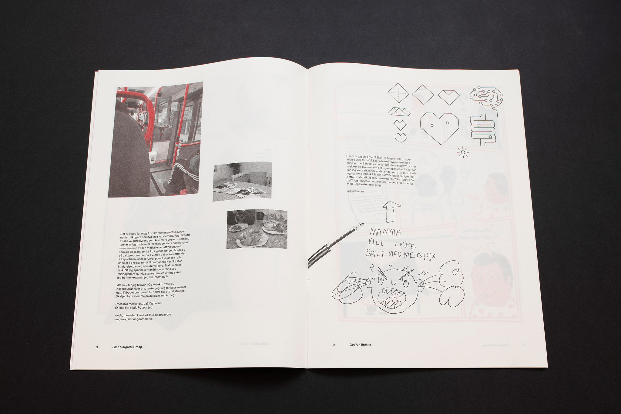 During late summer and autumn 2019, an open call was sent out where the general public was invited to answer the question How do you find your (political) voice? The question was asked in connection with the relevant Municipal Council and County Council elections in September of the same year. 28 brave people answered this question through the technique of their choice, which resulted in text, photo, illustration, collage, poem, cartoon and a flowchart. Some have turned to family to find answers, others to nature. One group addresses the public debate, to NRK. With other participants, the dialogue is at the center, the dialogue with oneself or with the family. Here you will find ideologies, bike rides, the Political Quarter, Climate Roar, fear, gratitude and doubt. But in the desire to express oneself there is no uncertainty. There is strength and courage.