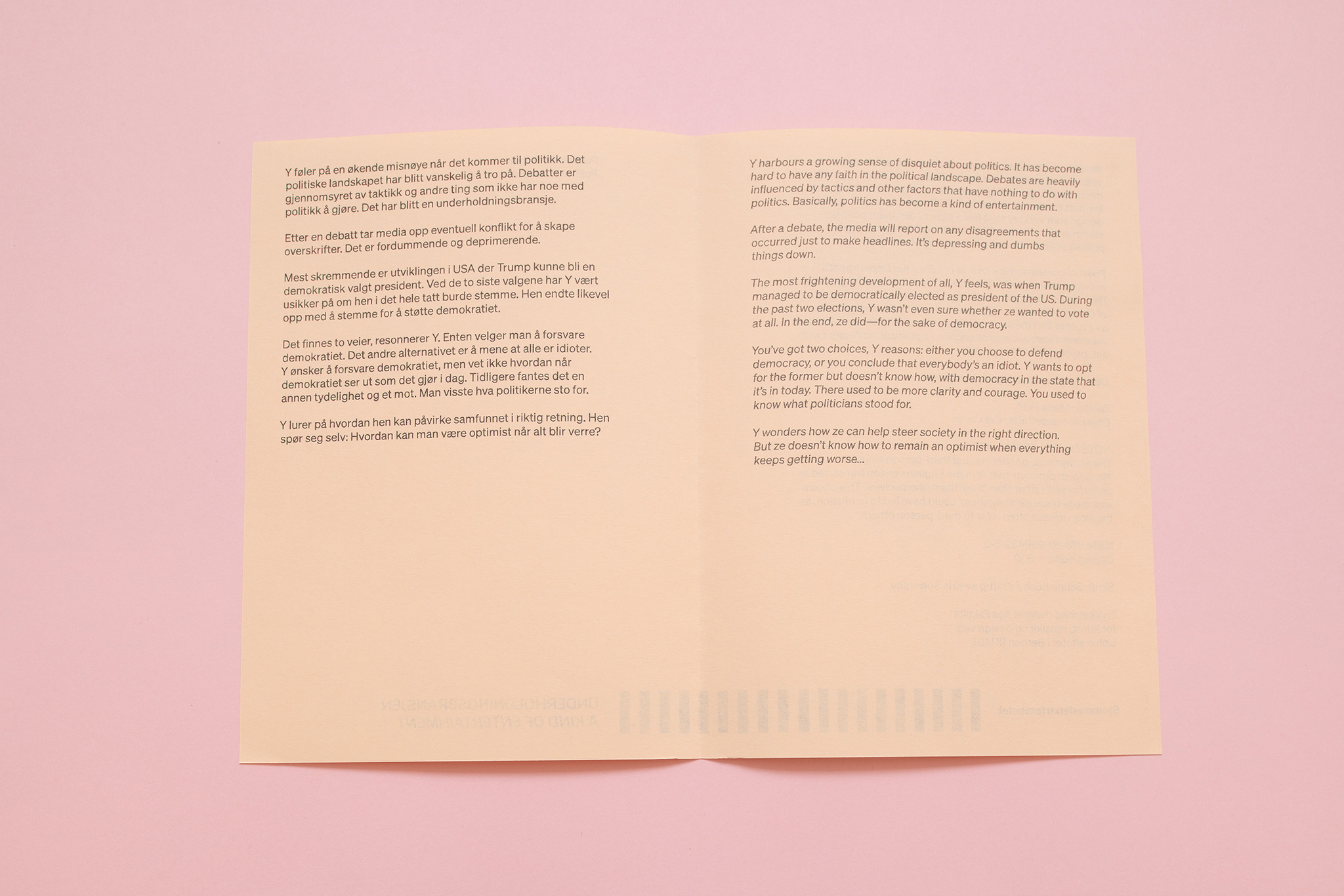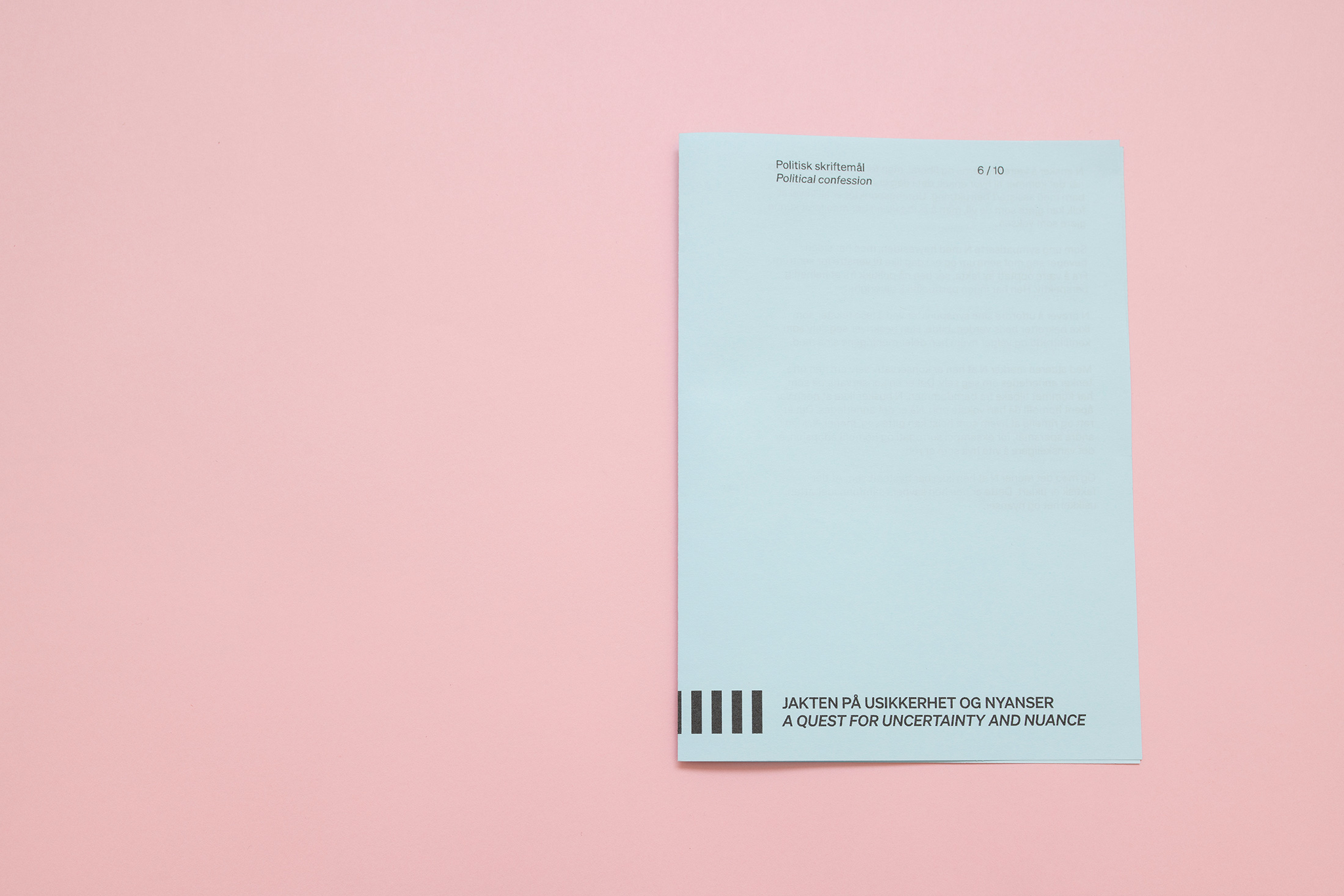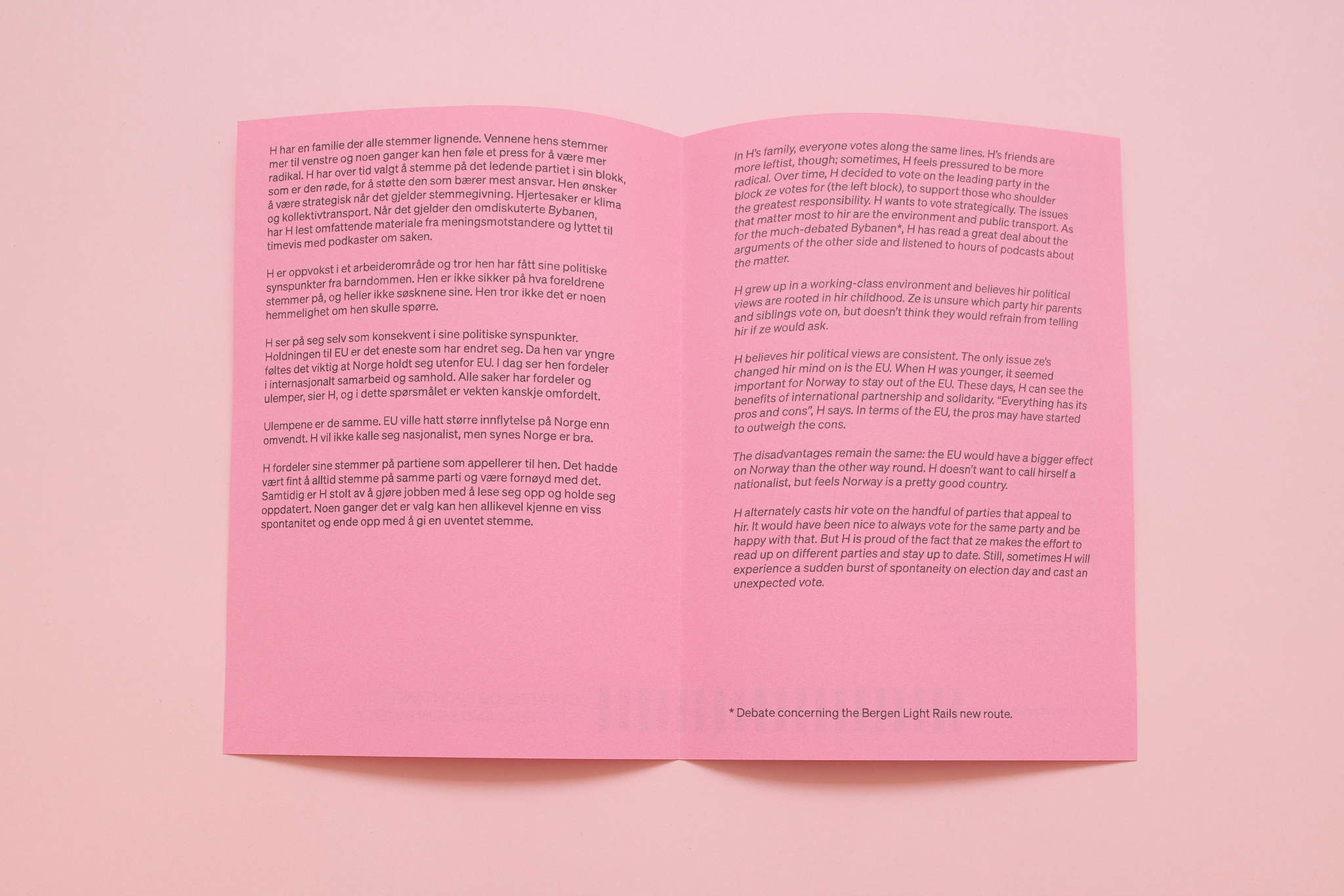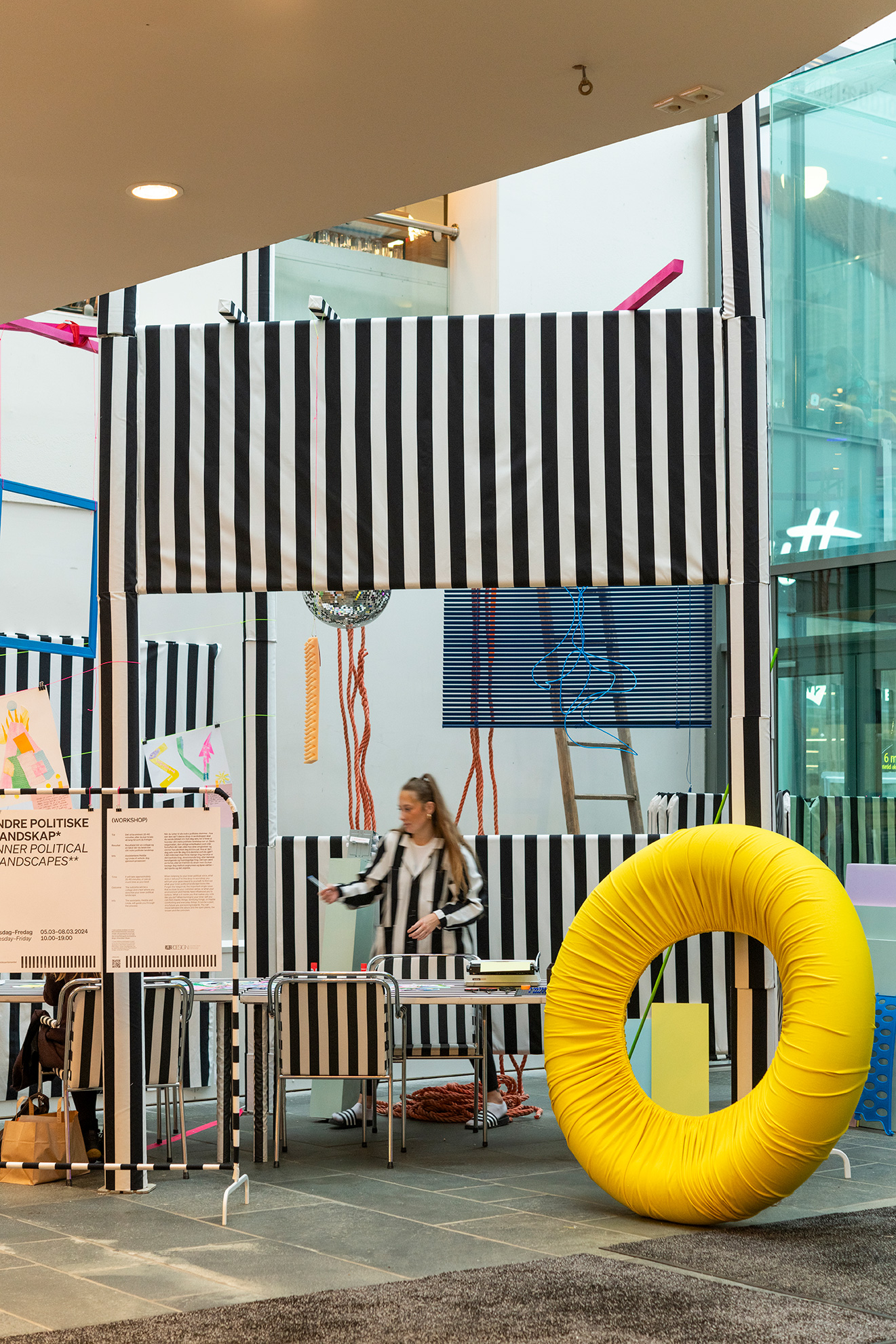From March 5 to 8, 2024, the artistic outcome of the project was showcased at Bergen Storsenter and Bergen Public Library. This presentation featured the Inner Political Landscapes workshop, the Political Confessional (object) and accompanying publication Political Confessions, the Voices publication, and the lecture Design, Participation and Democracy. All these elements were unified under the (fictional) governmental entity – the Stemme Department.