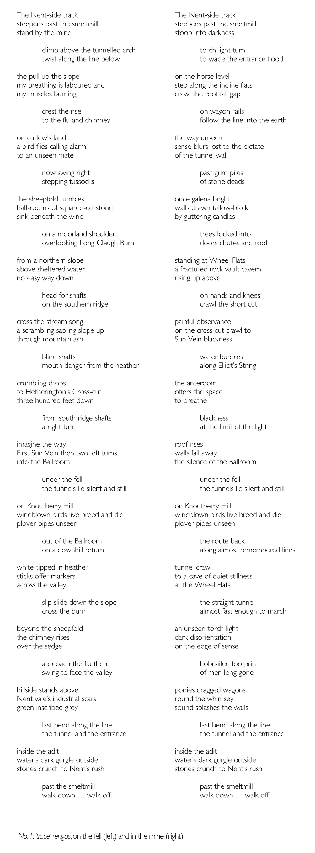 The work was presented in the ACA (Allenheads Contemporary Arts) Gallery as an ambisonic octagonal array playing a pre-formatted durational sound piece and was also, on two occasions, presented as a live mixed performance piece.4 I produced a catalogue that had a cover printed with the title of the work on the front and an image based on the mine names on the back. It contained a bound sheet of tissue paper, a ‘trace no trace’ essay, the two rengas and a version of the composite map.