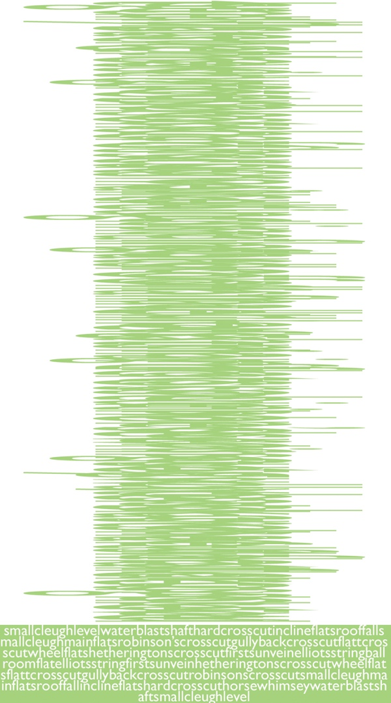 For each walk I wrote a set of verses in the style of a renga (below). I also recorded a series of spoken word recordings. I recorded my reading of the rengas that I wrote for each of the walks. I also recorded the names of the route inside the mine and formatted two versions of these—the first played with a two second gap between each name and the second played with no gap between them so they sounded like a single rapidly spoken sequence of words.