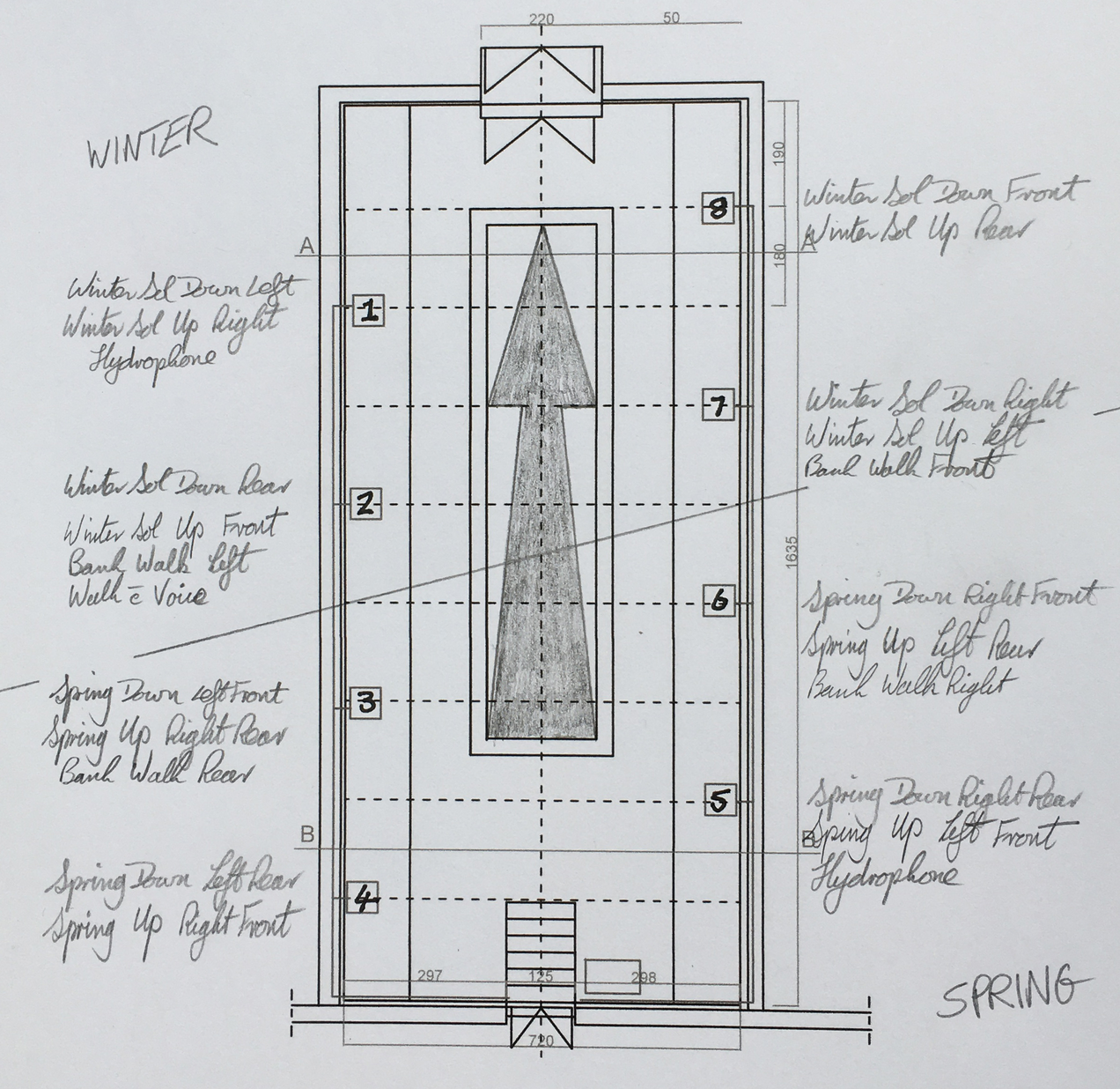 Rather than use the ambisonic diffusion as I had for Cheeseburn, I wanted to work with the more linear structure of the Steklenik Gallery and used the original quadrophonic structure of the recordings.2 To compose the work for the installation I assumed that the river flowed through the gallery from the entrance steps to the external door and that winter occurred in the far half of the gallery and spring in the near half. For the downstream walks the left-side microphones appeared in the left-hand speakers as viewed from the steps and for the upstream walks the left-side microphones appeared in the right-hand speakers as viewed from the steps.