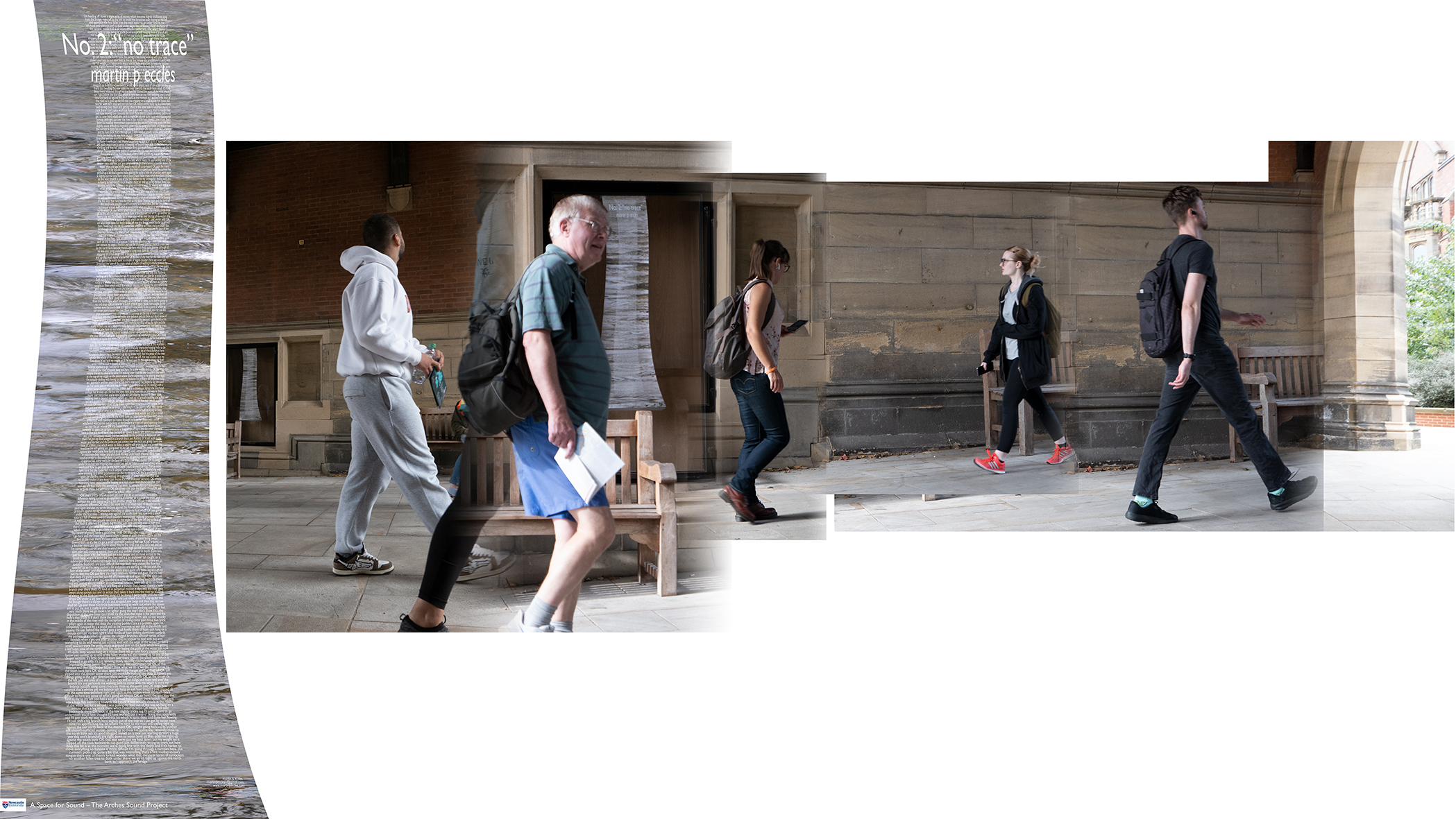 A quadrophonic version of the original recordings was presented in The Arches, Newcastle University during Mycelium. On this occasion they were edited into a quadrophonic sound file that played continuously as a loop. I produced a vertically orientated sinuous shaped poster using one of the composite photo images from the Cheeseburn installation that also contained all of the text from the steam of consciousness walk as a vertical column.