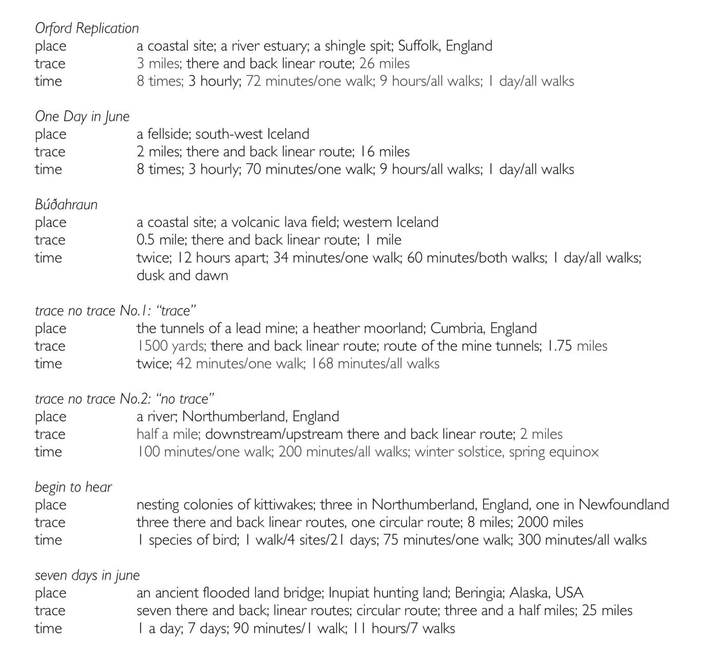 The works are summarised below (in the order of their making) with the dimensions inherent within their replication—place, trace and time—place(s) of action, a way/route of walking, and the various orderings of times that they occupy.