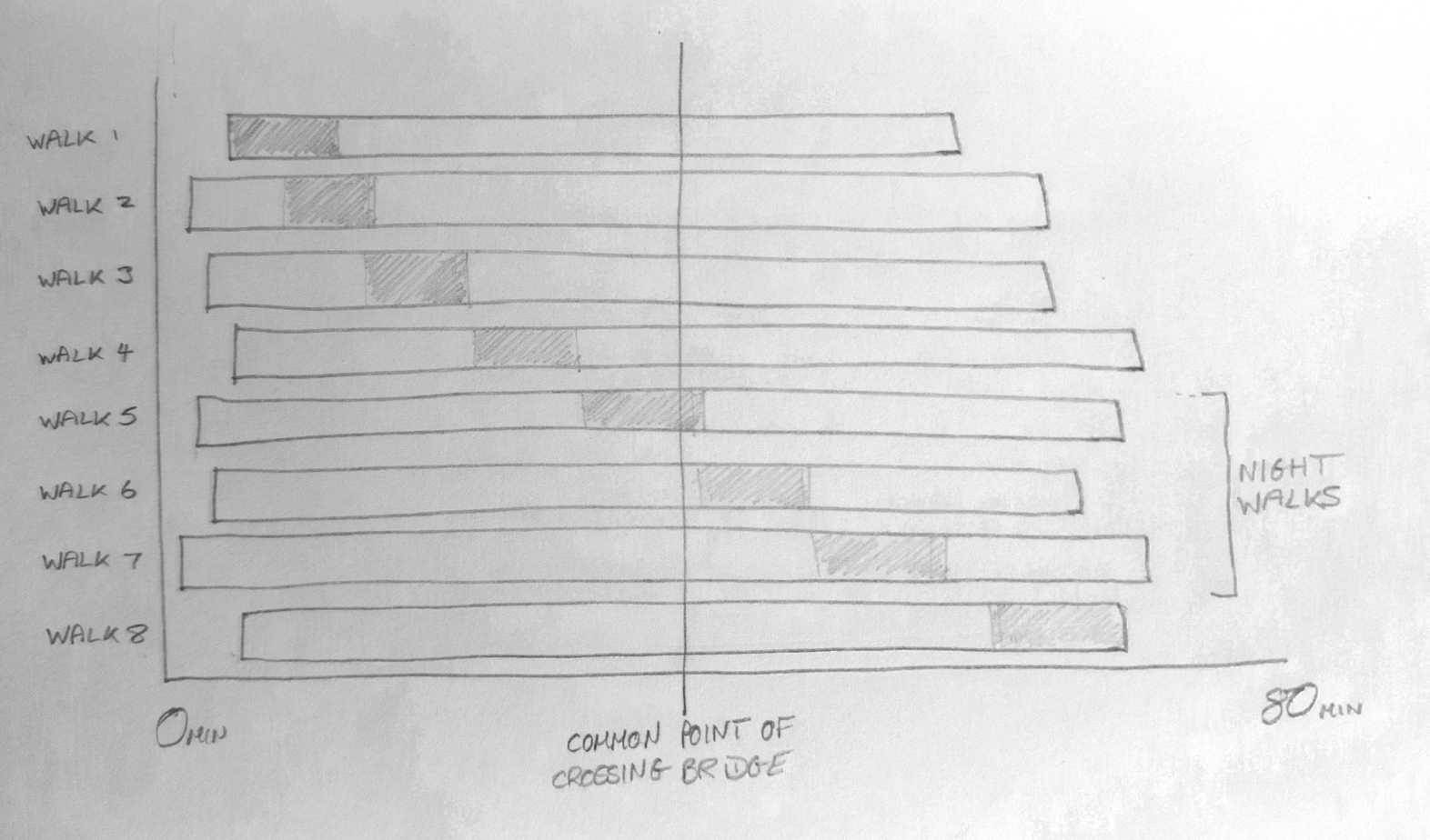 The structure for the composition was of the eight sequential recordings arranged in a digital audio workstation and centred around a common point, the point at which I walked across the metal bridge over Stoney Ditch.3 Whilst the walk itself took around 65 minutes, given the variation across the recordings the overall span of the eight recordings was 73 minutes. The general method that I used in composing is shown in the notebook sketch below—the eight recordings of Orford Replication with the indicative sections that were mixed down into a single stereo file for broadcast.