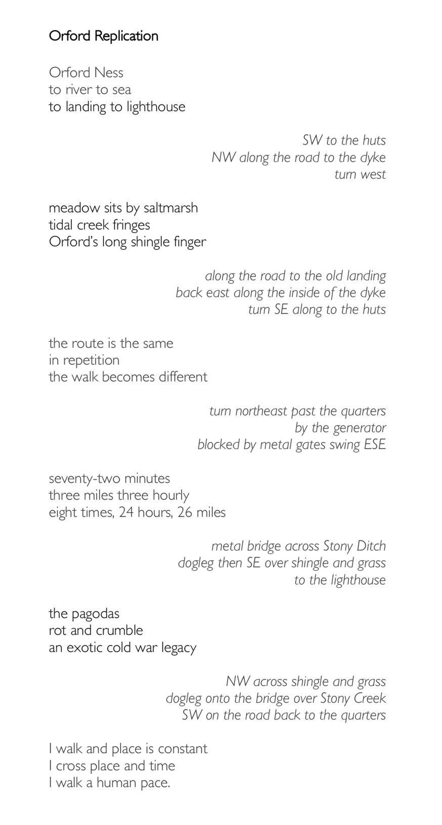 In July 2016 I spent three days on Orford Ness.1 I recorded myself walking a 3.4 ml. route across the Orford Ness, once every three hours for 24 hours.2 Orford Replication was composed for a radio broadcast, and this was the first occasion that I worked through this method of composing. I will describe it in detail here and then refer back to this for the later compositions using the same method.