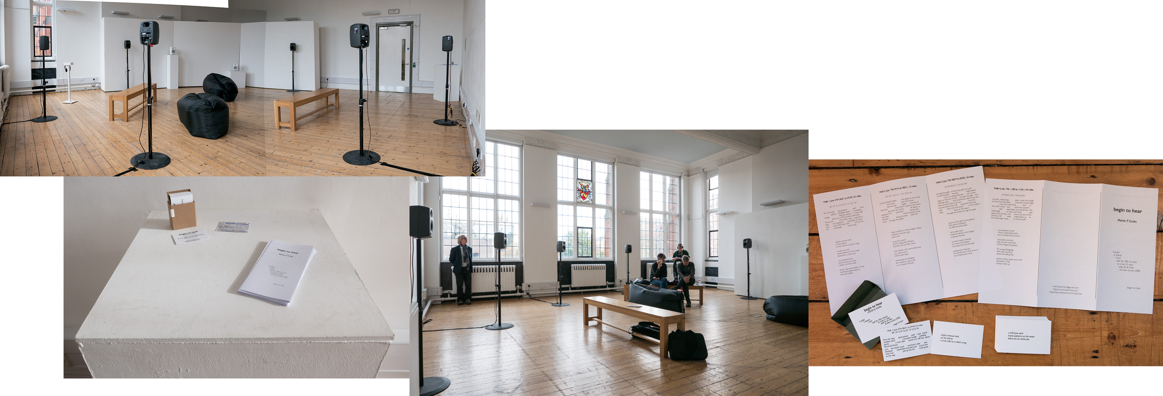 One set of four was arranged in a shallow arc, at the same height, on stands, and facing the other four speakers. These were set at different heights along a set of white floating walls using a mix of stands and plinths, forming a metaphorical cliff; the four cliff speakers played the field recordings made at the kittiwake colonies, the four facing them played the field recordings of my walking to and from the colonies.