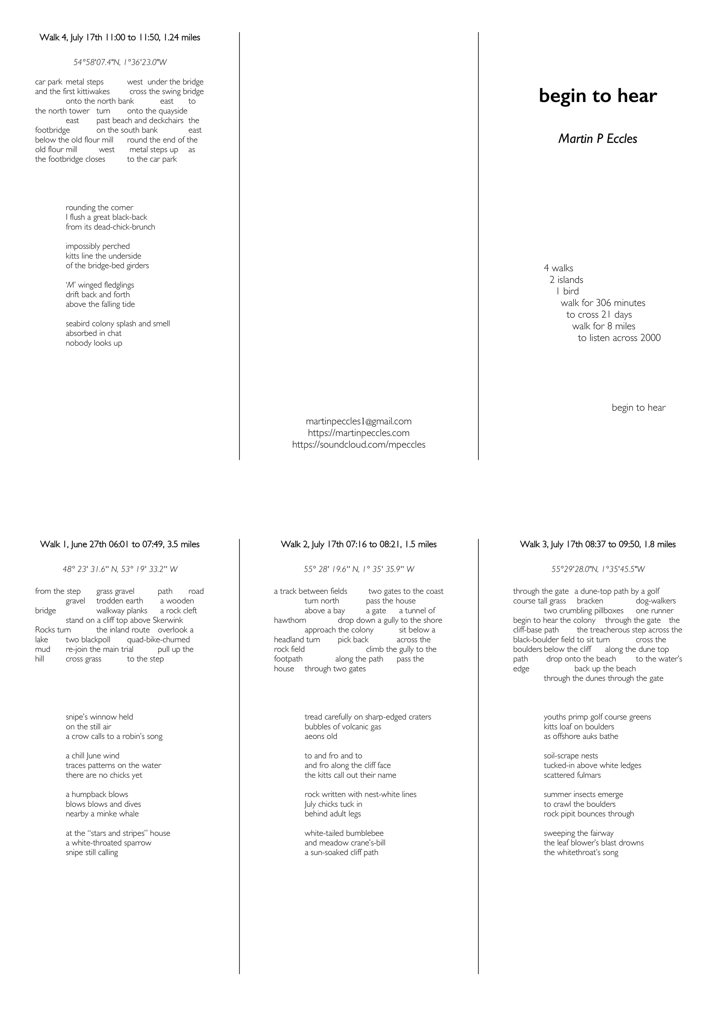Prior to begin to hear my replicated walks had used the method of my walking the same route in the same geographical location over time so that my compositions presented movement over time and distance. begin to hear was the work in which I began to take a more conceptual approach to what was being replicated; here I was walking to the same place by virtue of it being the site of the same biological phenomenon, a breeding site (a cliff) of the same seabird (the kittiwake) with the same sound. Thus, replication is founded in the biological and sonic attributes of a place, rather than a geographical location.