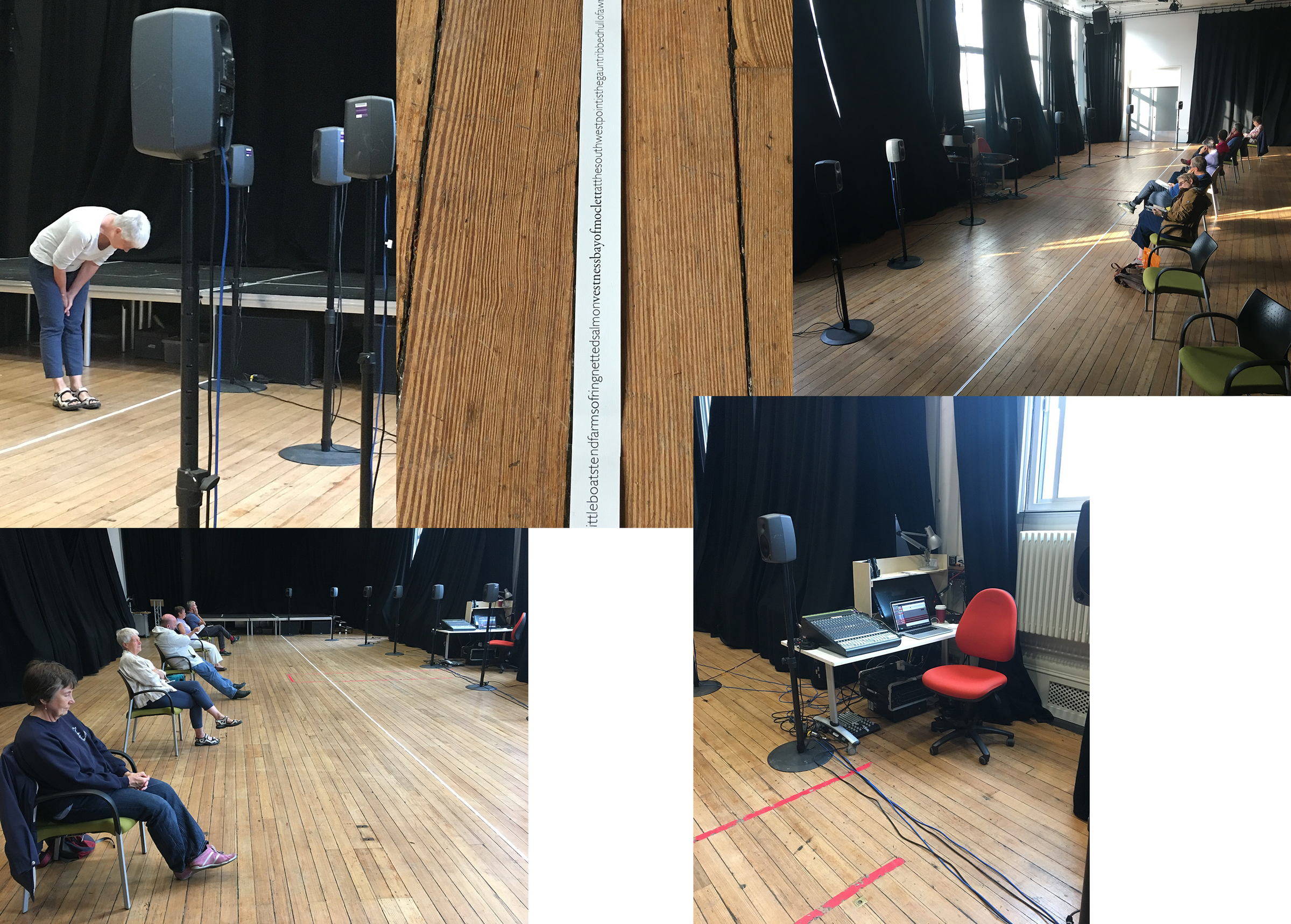 The work was presented as a nine-channel, 10-hour 35-minute performance sound piece, performed at the same time of day that it was recorded (below). A catalogue contained an introduction of the piece and the two poems. Its front cover showed a composite photograph of the inside of the outhouse and the back, a double page from my notebook. The scripta continua was laid on the floor.