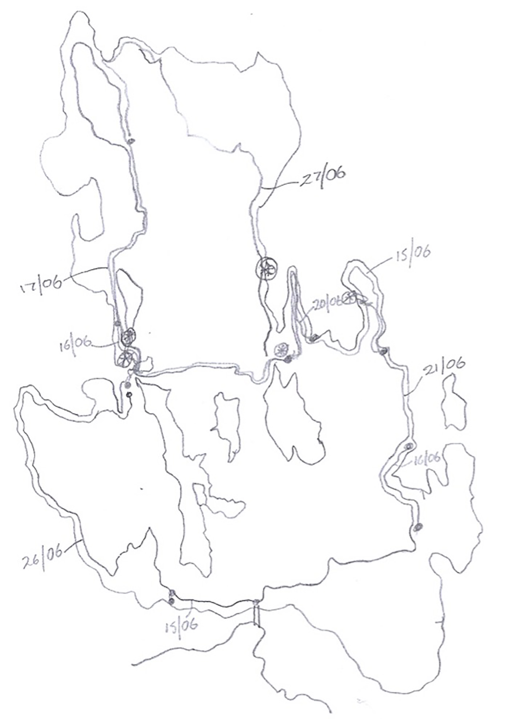 Between the 9th and 28th June 2018 I made four static recordings over three days that together covered a period of 24 hours and I made 17 walking recordings across eight days that together spanned from 06:27 to 17:45 (below left).4 Together the walking recordings presented a circumnavigation of the island (below right).
