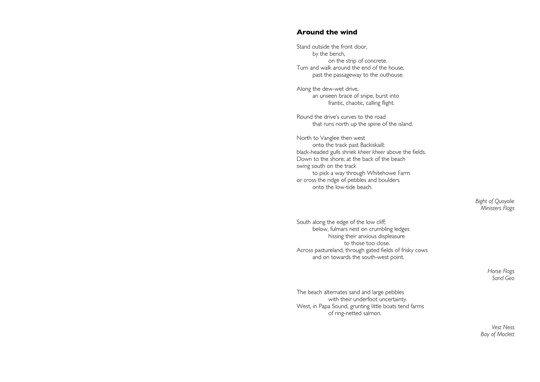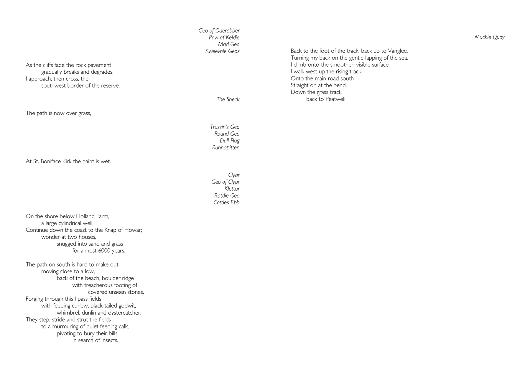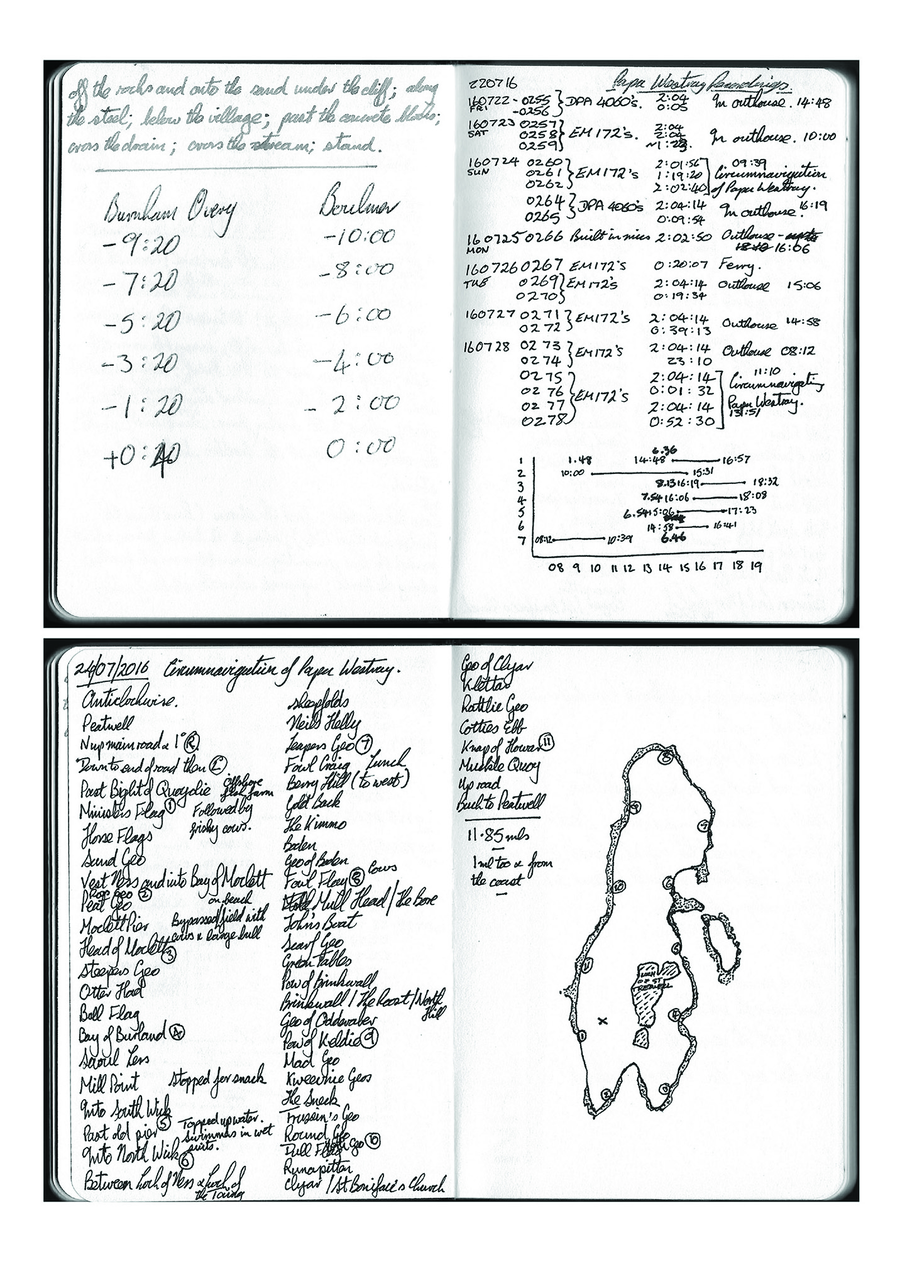 In this thesis, having introduced my research questions, in Chapter 2 I present a layered analysis of the important contexts of my practice—walking, sound, walking poetry, and place. In Chapter 3 I present and discuss three works that together explore how it is that I know the world as a sensate embodied walker. In Chapter 4 I develop what I came to call replicated walks—walks made more than once in the same place. Begun in order to re-configure time, they also led me to extend my consideration of place beyond that defined by geography, to place defined by biological phenomena or socio-cultural coherence. In Chapter 5 I describe my emerging ideas of human-scale of place and my underlying ideas of island-ness. Initially I worked on real islands, walking circumferential routes and those defined by chance procedures. From this I developed an imaginary island in the foothills of Northumberland’s Cheviot Hills; made from the human-scale of my embodied walking this led to my creation of an imaginary pandemic island of containment, created in a city, in my locale, made, and made real, by the traces of my embodied walking. Together my works constitute a body of work that represents a contribution to knowledge with specific contributions of: the use of Replicated Walks as a method of experimenting with time and place; Walking Words – the presentation of poetic text in forms (concertina-fold books, scripta continua, scrolls) that requires walking to engage with it, and that also function as metonyms for my original walking act; Walking Islands –the use of human-scale walking to imagine an island into existence, and then invoke the island as a lens through which to continue to pursue the idea. My work also contributes knowledge to the methods of how to record the sounds of the world whilst walking through it, over extended distances and time.