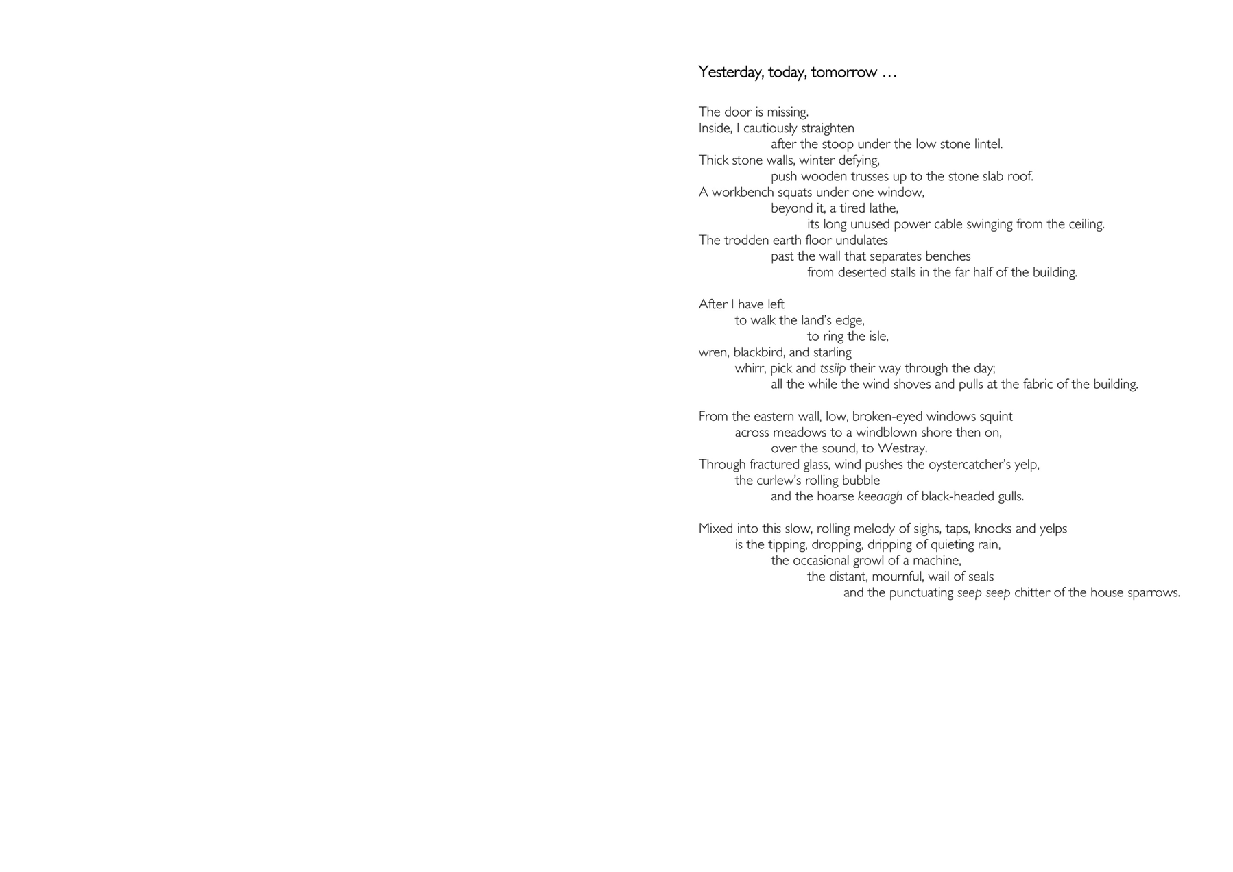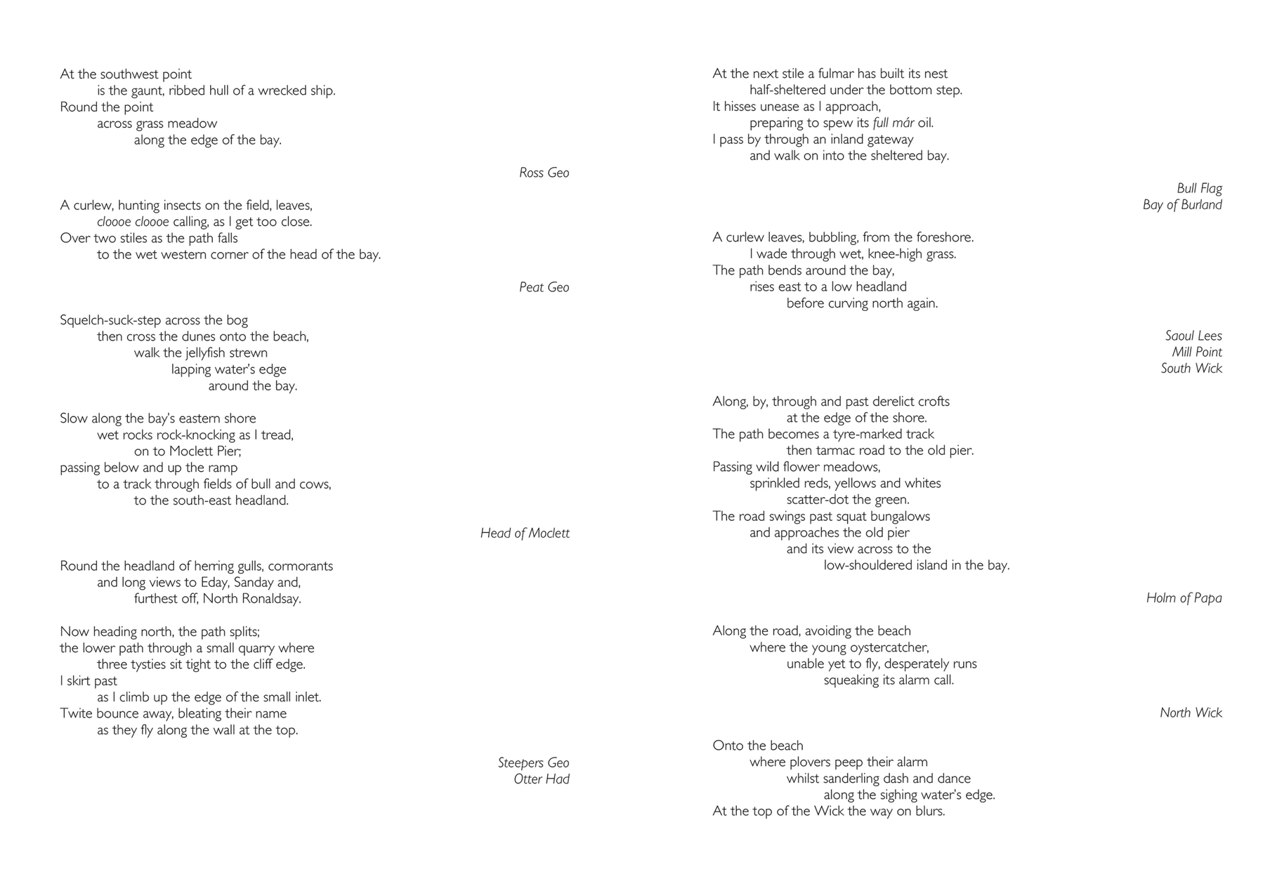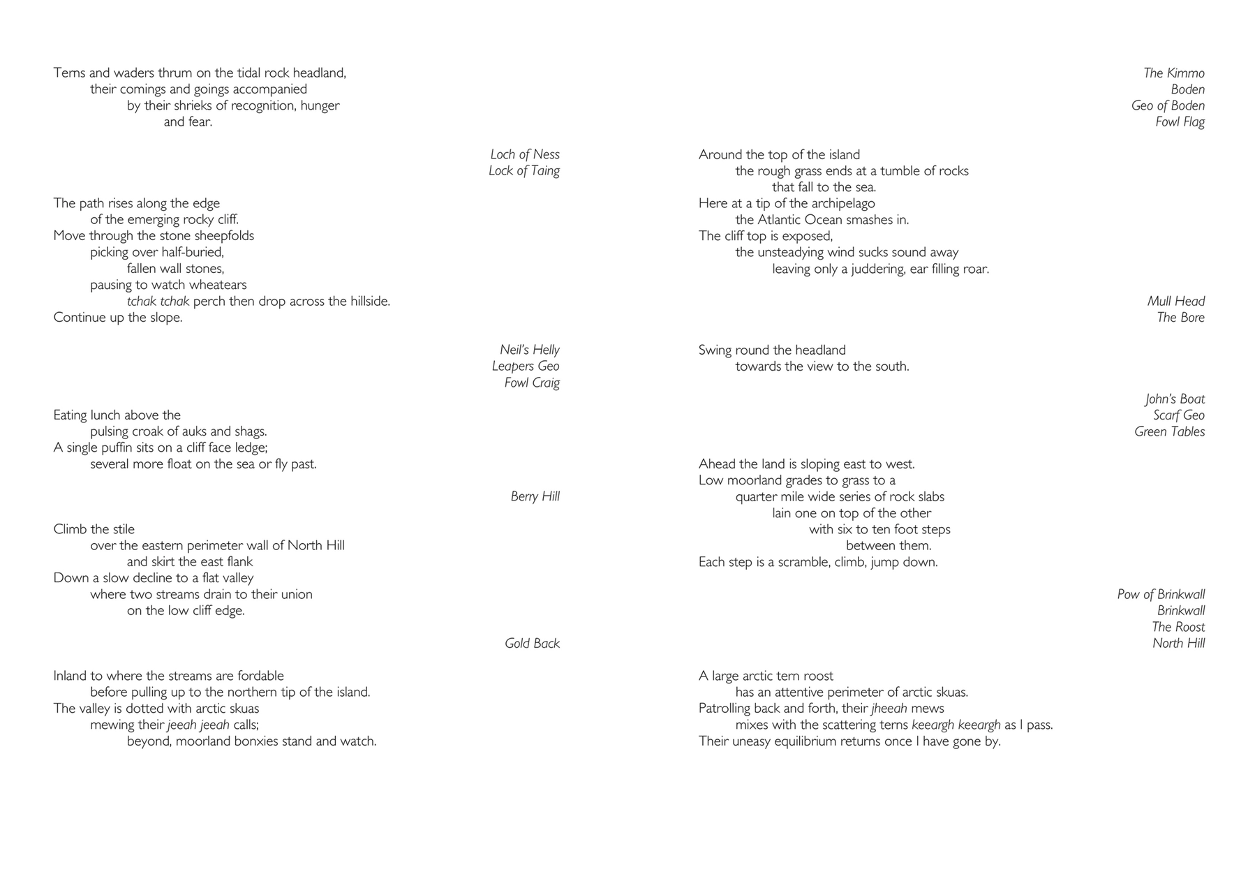 In this thesis, having introduced my research questions, in Chapter 2 I present a layered analysis of the important contexts of my practice—walking, sound, walking poetry, and place. In Chapter 3 I present and discuss three works that together explore how it is that I know the world as a sensate embodied walker. In Chapter 4 I develop what I came to call replicated walks—walks made more than once in the same place. Begun in order to re-configure time, they also led me to extend my consideration of place beyond that defined by geography, to place defined by biological phenomena or socio-cultural coherence. In Chapter 5 I describe my emerging ideas of human-scale of place and my underlying ideas of island-ness. Initially I worked on real islands, walking circumferential routes and those defined by chance procedures. From this I developed an imaginary island in the foothills of Northumberland’s Cheviot Hills; made from the human-scale of my embodied walking this led to my creation of an imaginary pandemic island of containment, created in a city, in my locale, made, and made real, by the traces of my embodied walking. Together my works constitute a body of work that represents a contribution to knowledge with specific contributions of: the use of Replicated Walks as a method of experimenting with time and place; Walking Words – the presentation of poetic text in forms (concertina-fold books, scripta continua, scrolls) that requires walking to engage with it, and that also function as metonyms for my original walking act; Walking Islands –the use of human-scale walking to imagine an island into existence, and then invoke the island as a lens through which to continue to pursue the idea. My work also contributes knowledge to the methods of how to record the sounds of the world whilst walking through it, over extended distances and time.