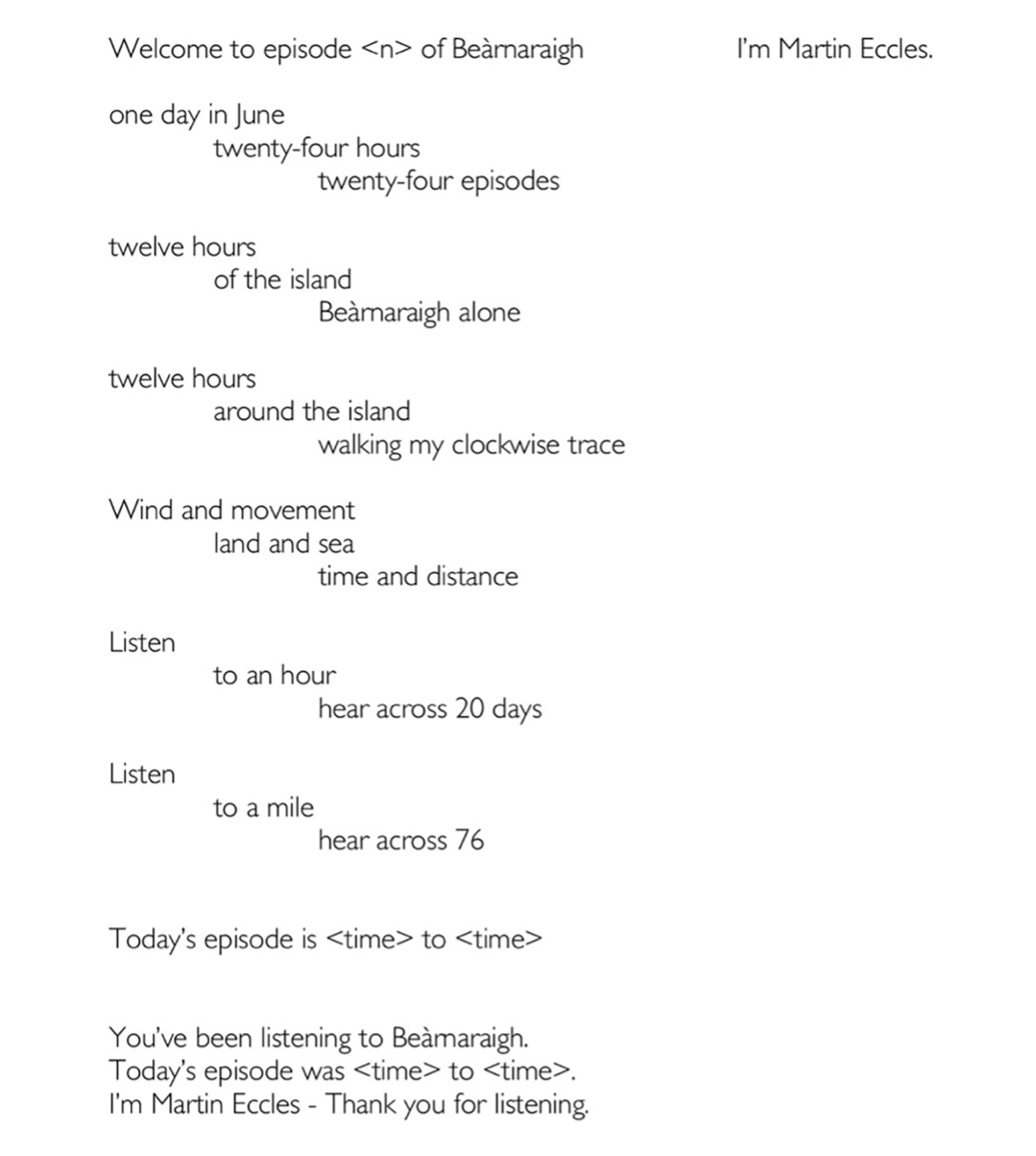 With the recordings sequenced from 00:00:01 and running through to 24:00:00, and entitled Beàrnaraigh, the work was broadcast as 24 sequential one-hour episodes.4 Each episode was accompanied by a composite image of Beàrnaraigh and each had a spoken introduction and a brief outro (both below). Two of these one-hour broadcasts are included in the curated list of files for examiners.
