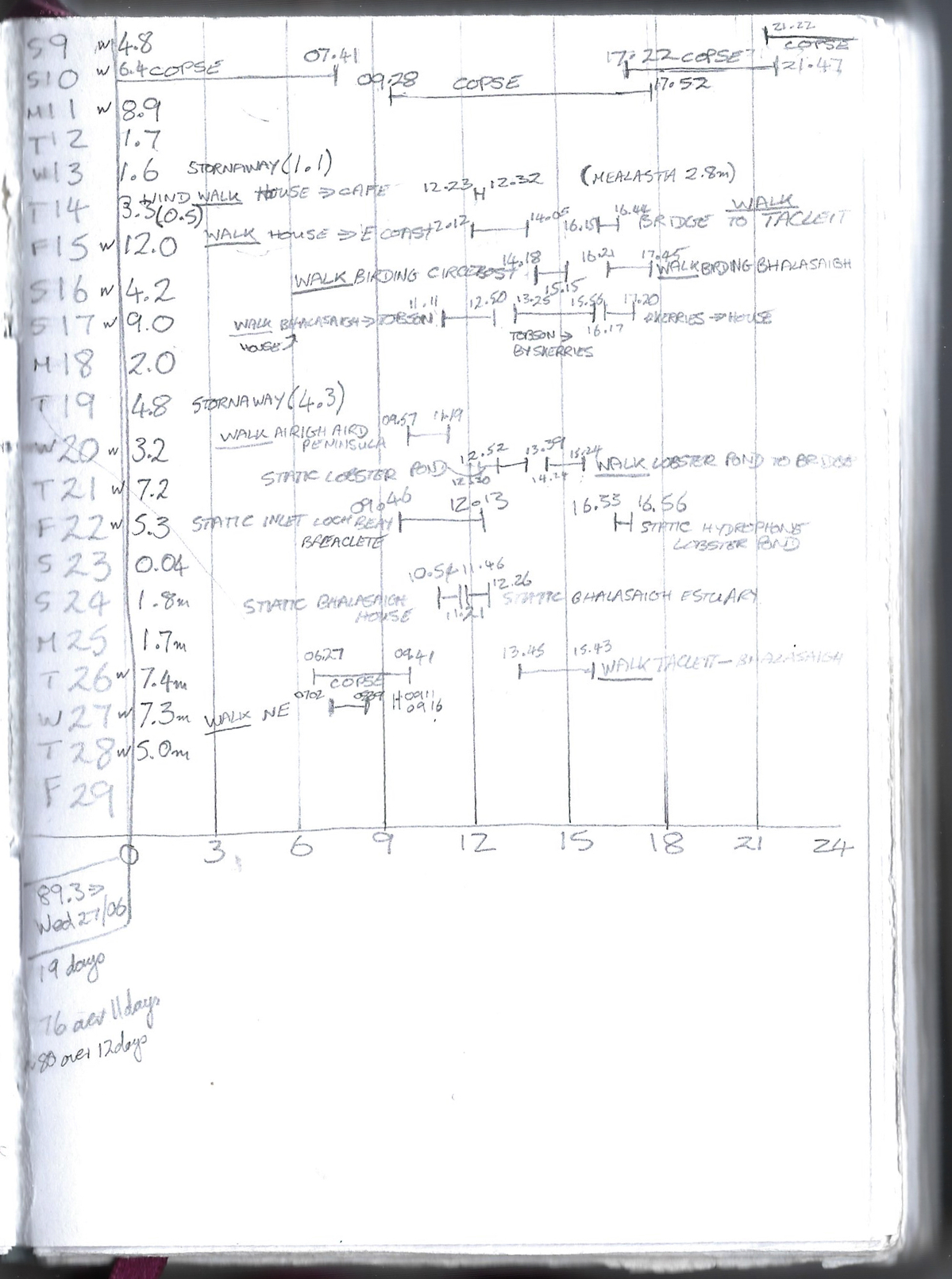 This was a ‘new day’, the whole of a single diurnal cycle (as well as presenting a circumnavigation walk of the whole of the island), yet given the compositional nature of the work, the continuity of time is an illusion as I took recordings from across 20 days to create one day.5 Having previously argued against mixdowns, when creating replicated walk works for radio (such as Orford Replication), here I experimented with doing exactly this. My concern was the loss of sonic clarity and definition within a mixdown. Here, for much of the time, only two tracks were playing (though this went up to four for short periods) and such a degree of simultaneity felt, and to me sounded, acceptable.
