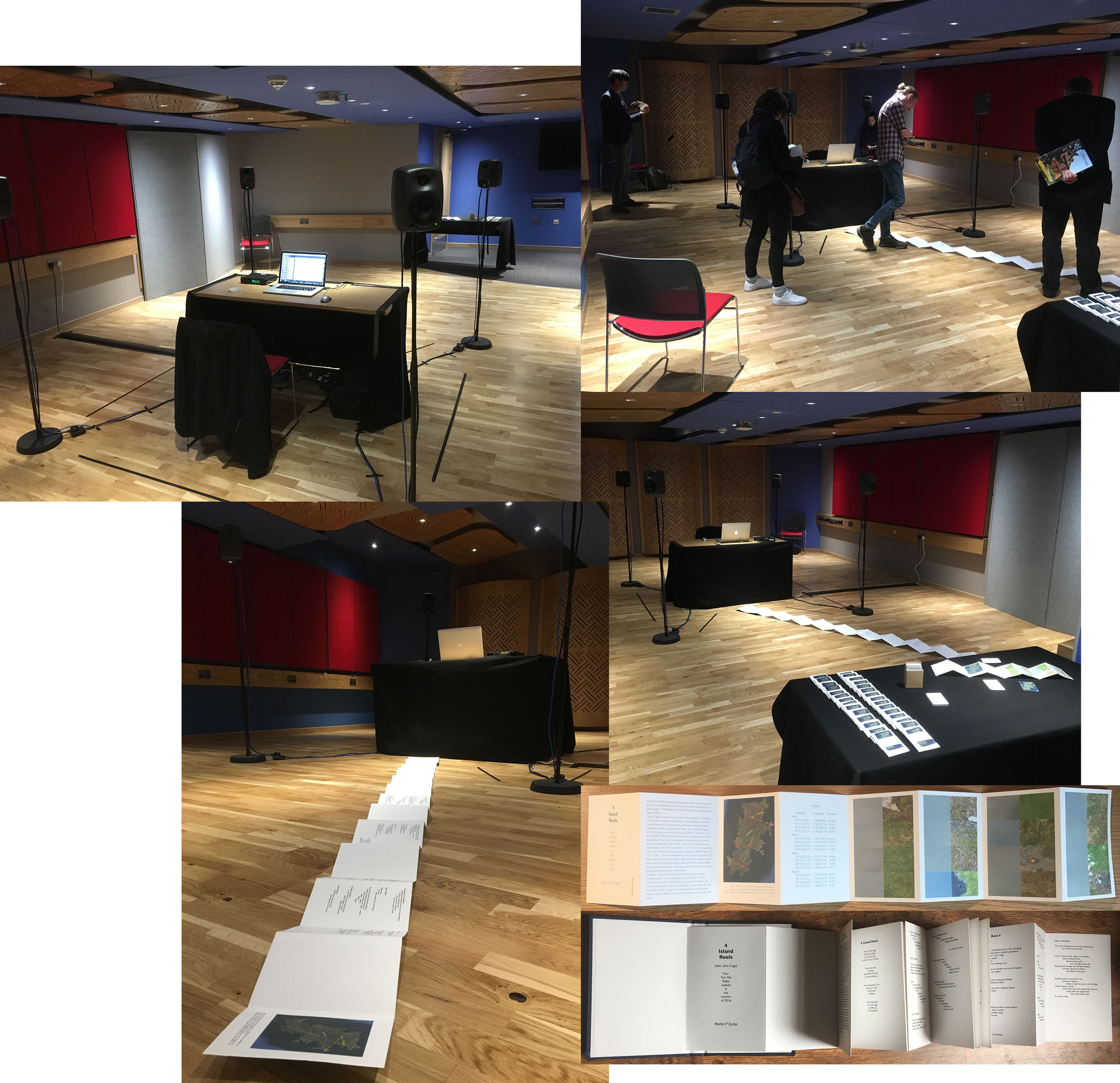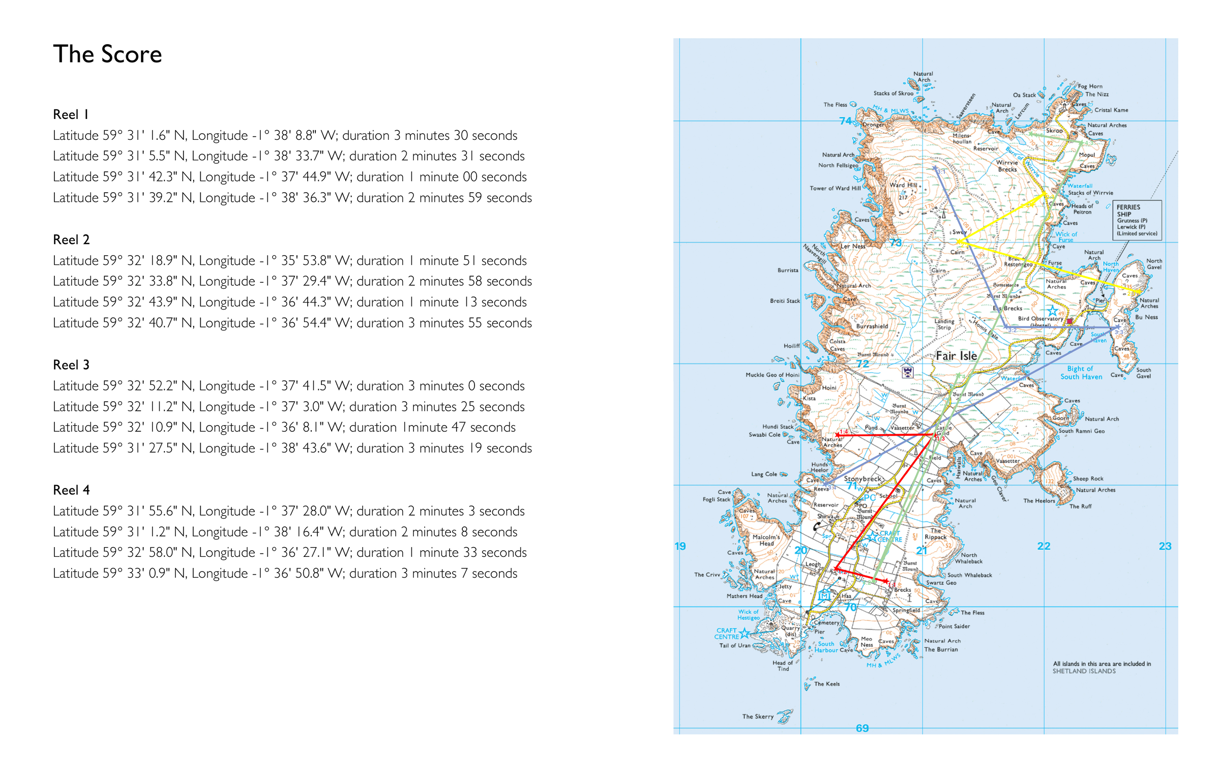 My first Random (Island) work was first presented as a 28-minute four-channel installation (below). The static recordings of the four steps of a reel (e.g., Reel 1 steps 1–4) played simultaneously, one per channel; the reels playing twice in sequence, Reel 1 to Reel 4.8 A booklet presented the piece and the score and there were four composite images based on maps of the locations.