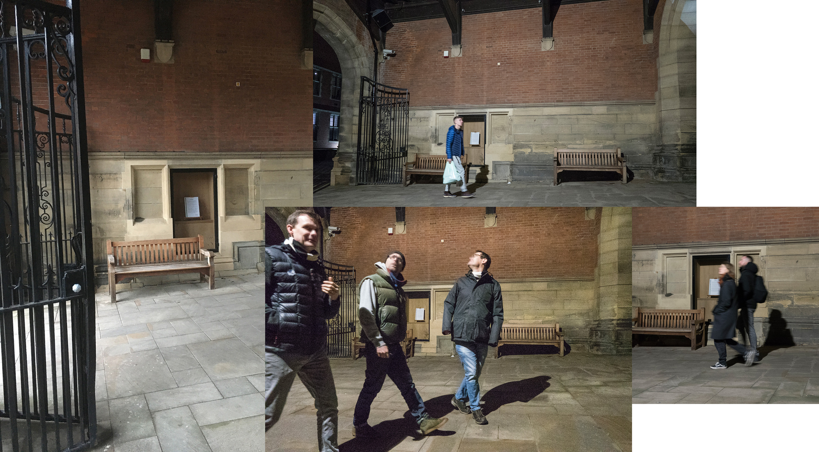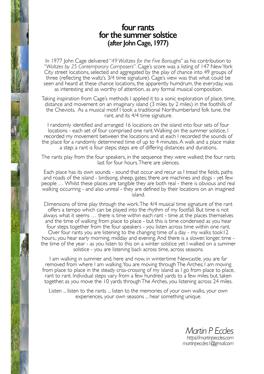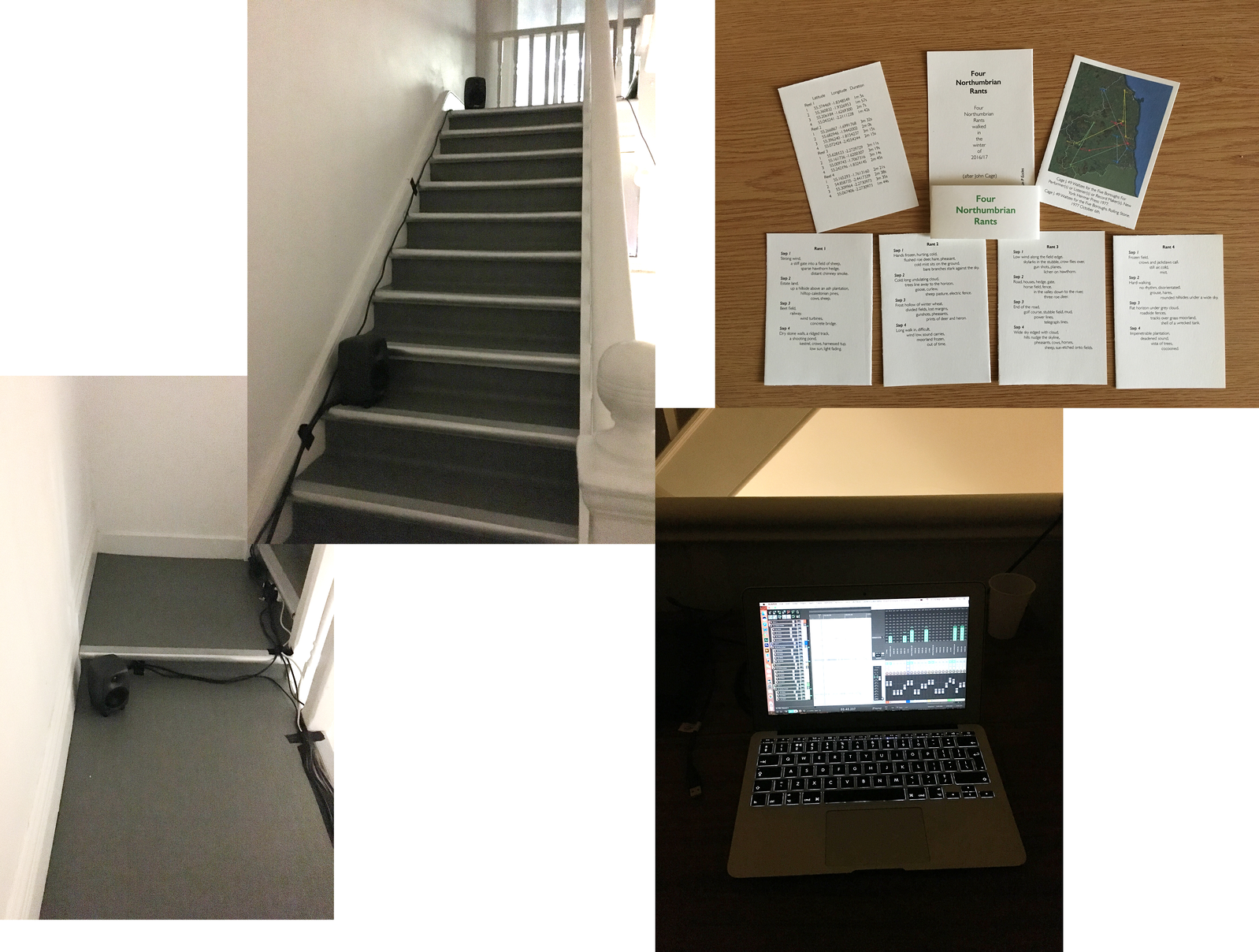 The first presentation of the work was four rants for the summer solstice (after John Cage, 1977) a four-channel, looped, four-hour work that played for 48 hours over the 2019 winter solstice in The Arches on Newcastle University campus. Steps 1–4 of each Rant played simultaneously, and the Rants played in sequence (Rant 1–Rant 4). Each step was composed of its walk recording then place recording; the Rants were synchronized on the start of the place recordings with the four steps each coming from one of four speakers.6