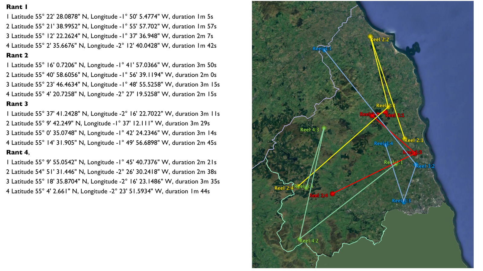 The Fair Isle Reels (and both Alnay and Contención Island, of which more below) present a humanness of scale ... they draw out my human scale, either mapped onto a real island or walking into being an imaginary one (to be presented and discussed below in 5.5 Imagined Islands). This important point was clarified for me through the practice of recording Four Northumbrian Rants. To record each Rant, I had to drive over 100 miles and the idea of how and where to walk (which should have been central to the work) felt lost. I recorded the walk from wherever I parked my car to the site of the Rant and back, usually the closest point on a tarmacked road. A further difference was that on the relatively small scale of Fair Isle, where I had already been for three days by the time of the first recordings, and thereby had a degree of familiarity with the place, the precise locations of the Reel steps were relatively easy to identify and walk to. On the larger scale of the Rants, where all the locations were unfamiliar, they were often more difficult to locate with the same degree of confidence. Thus dawned the realisation that I walk at a certain scale, and that this scale is one that is intimately linked to my bodily capabilities and is a fundamental link between my body and the world. I know the world through having a body; I move on the ground and through the air; how far I move and how much of the world I thus know is a dimension of my embodiment (Merleau-Ponty, 2005, p. 169). I not only know the world through having a body, I know an embodied amount of it. This amount will vary from day to day, season to season - and in this sense, it is the scale of my world—and it is intimately linked to my body.