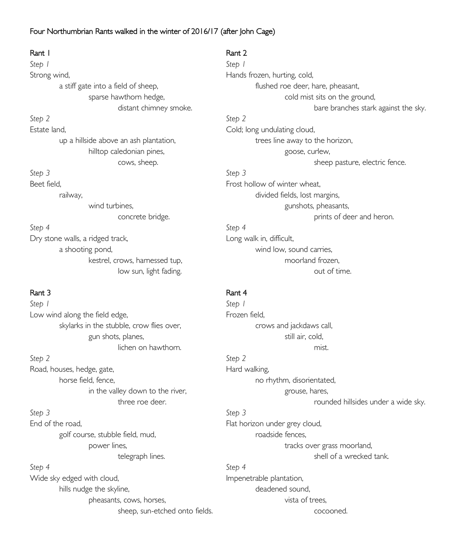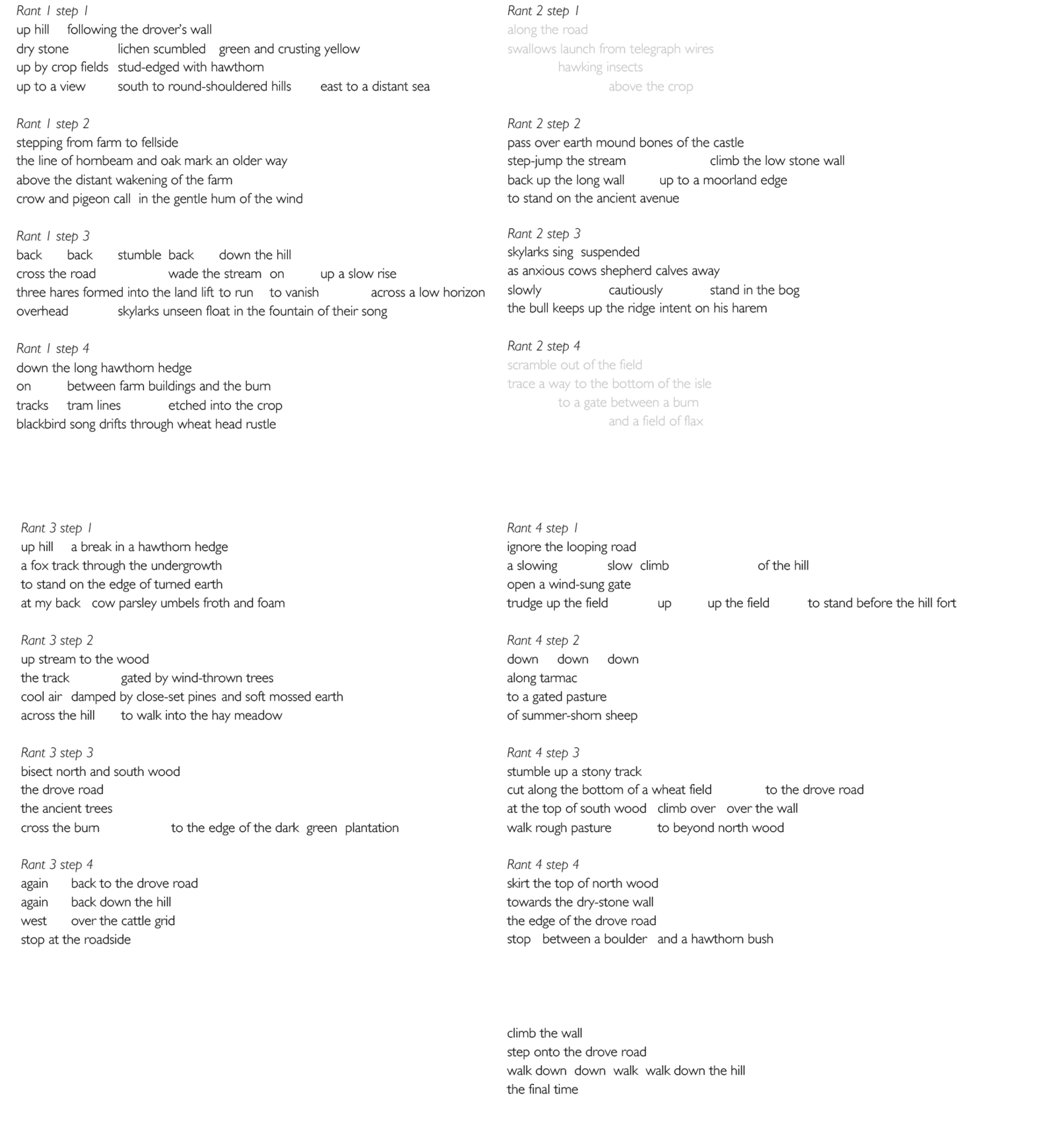 Walking on the summer solstice 2017, the longest day and the turning point of the year, I recorded my walking between the locations of the Rant steps in sequence (Rant 1 steps 1–4, Rant 2 steps 1–4, and so on) and at each I recorded the sounds of the place.5