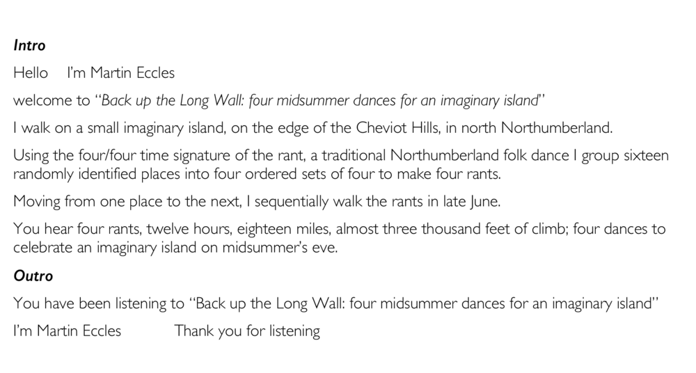 The second presentation of the work was as a four-hour, stereo, radio broadcast at Radiophrenia 2020. With an incorporated studio recording of an intro and outro (right) the Rants played in sequence (1–4) and on this occasion the rants were synchronized from the start of the walks of each step. This composition facilitated the incorporation of a studio recording of my reading of my accompanying poetry (below).7