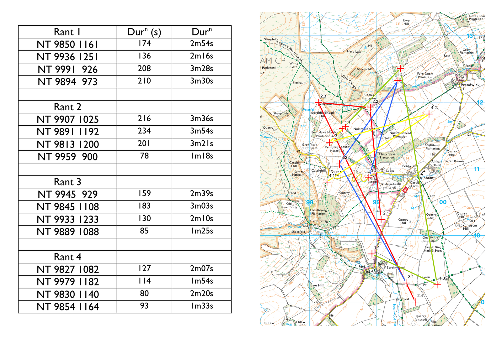 After realising the issue of scale and ‘loss of walking’ in 4 Northumbrian Rants, I looked to create a work in a place that I could cover by walking and one that, to some extent, I knew. I chose a small area in north Northumberland.3 I again took the metaphor of the Rant as the basis of the ‘chance process’ that I had used previously.4 This identified the 16 locations within the two-by-four-kilometre area, organised into the four steps of four Rants as shown, along with recording durations, in the score (Figure 5.15).