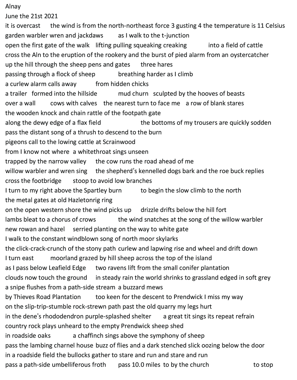 I visited my imaginary island on the summer solstice in June 2021 and, starting at sunrise, I made a quadrophonic recording of my walking the shore in a clockwise direction (a circumnavigation as I had done in the (A)Round Islands works). I also composed a prose poem from notes made immediately after completing the walk (right).