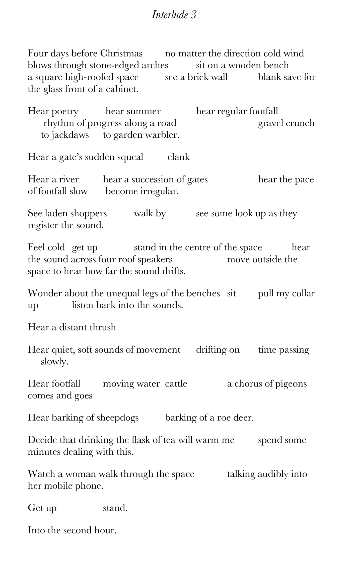 In this thesis, having introduced my research questions, in Chapter 2 I present a layered analysis of the important contexts of my practice—walking, sound, walking poetry, and place. In Chapter 3 I present and discuss three works that together explore how it is that I know the world as a sensate embodied walker. In Chapter 4 I develop what I came to call replicated walks—walks made more than once in the same place. Begun in order to re-configure time, they also led me to extend my consideration of place beyond that defined by geography, to place defined by biological phenomena or socio-cultural coherence. In Chapter 5 I describe my emerging ideas of human-scale of place and my underlying ideas of island-ness. Initially I worked on real islands, walking circumferential routes and those defined by chance procedures. From this I developed an imaginary island in the foothills of Northumberland’s Cheviot Hills; made from the human-scale of my embodied walking this led to my creation of an imaginary pandemic island of containment, created in a city, in my locale, made, and made real, by the traces of my embodied walking. Together my works constitute a body of work that represents a contribution to knowledge with specific contributions of: the use of Replicated Walks as a method of experimenting with time and place; Walking Words – the presentation of poetic text in forms (concertina-fold books, scripta continua, scrolls) that requires walking to engage with it, and that also function as metonyms for my original walking act; Walking Islands –the use of human-scale walking to imagine an island into existence, and then invoke the island as a lens through which to continue to pursue the idea. My work also contributes knowledge to the methods of how to record the sounds of the world whilst walking through it, over extended distances and time.
