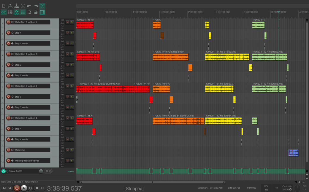 Reels 1 to 4 are coloured red, yellow, blue, green. The Reels from walk 1 are presented, then the Reels from walk 2. There is volume adjustment shown by the red lines.