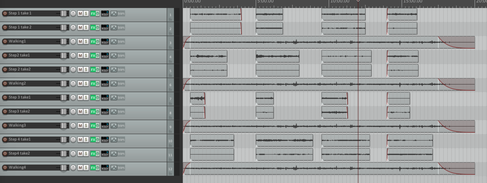 Reels 1 to 4 are sequenced left to right. The recordings from both walk 1 and walk 2 played simultaneously for each step.