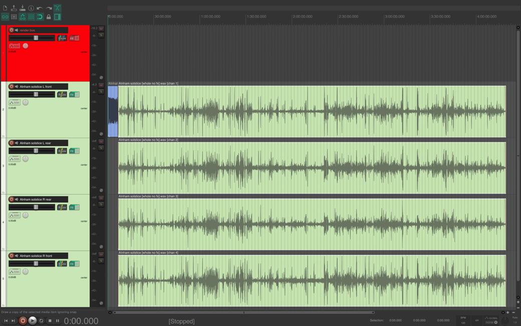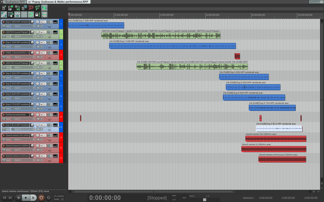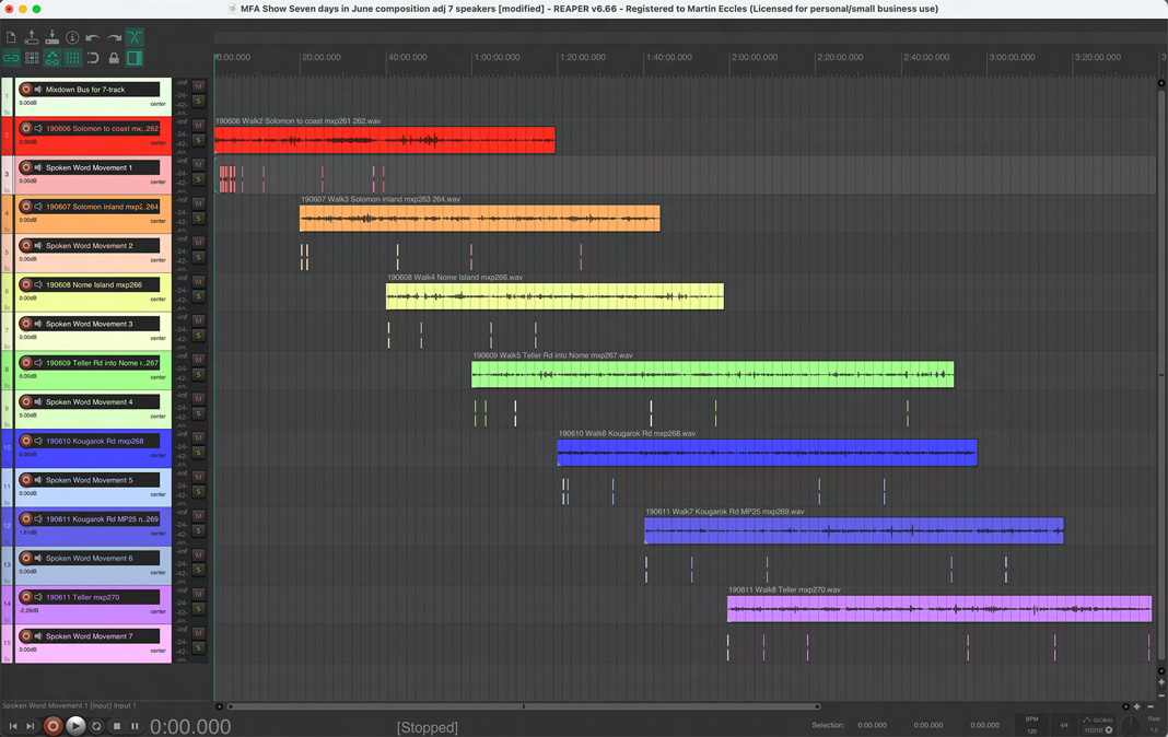 The left-hand side corresponds to 08:12:00 and all the tracks are then positioned at their time of recording relative to this. The seven blue tracks are the static recordings made in the outhouse, the two green tracks are the two island circumnavigations, and the red tracks are spoken word tracks. The short red 4th track is the spoken poetry; the three longer red tracks are the island names recorded with varying gaps between them. Shown here in their placeholder positions they were mixed into the performance at various and multiple points.