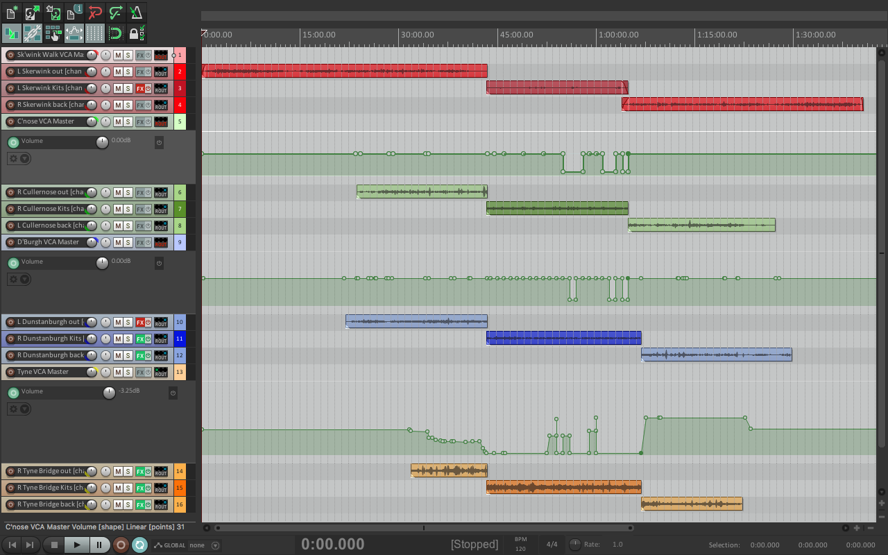 Track colour code: yellow downstream winter; pale green downstream spring; orange stream of consciousness upstream and downstream; dark blue hydrophone; mauve upstream winter; pale blue upstream spring. These files form the basis of the composition that was mixed down to a stereo format for the radio broadcast. Note the volume adjustment of tracks shown by the green lines with dots.